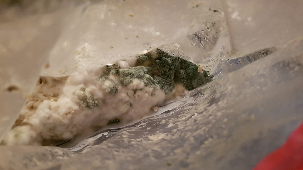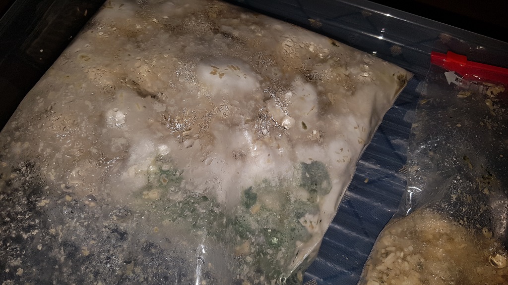 Leider fängt der Beutel jetzt schon wieder zu stinken an. Ich habe mir heute extra eine UV Lampe gekauft. Der mit Sporen bewachsene Teil liegt jetzt zerstückelt an der Luft.
