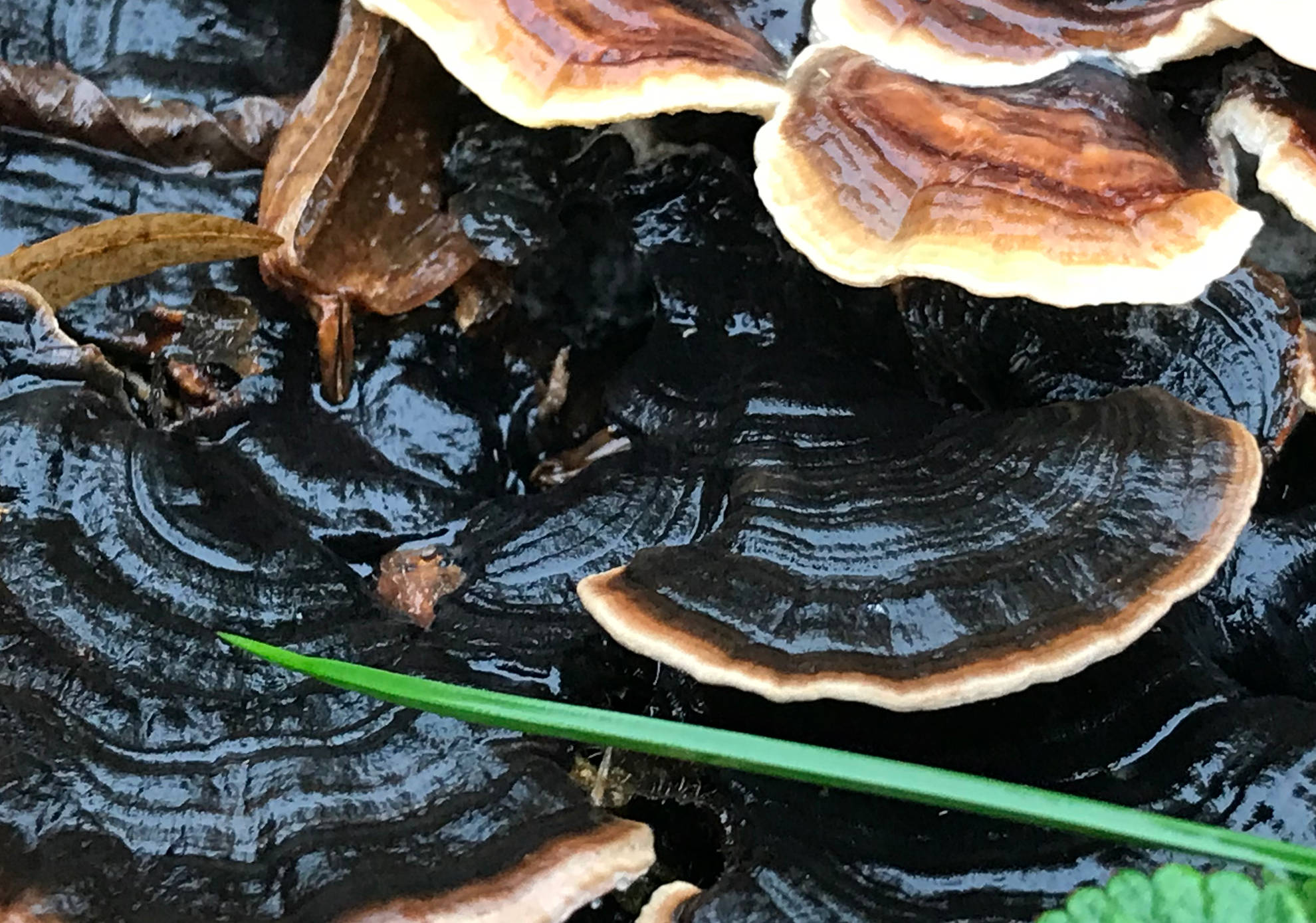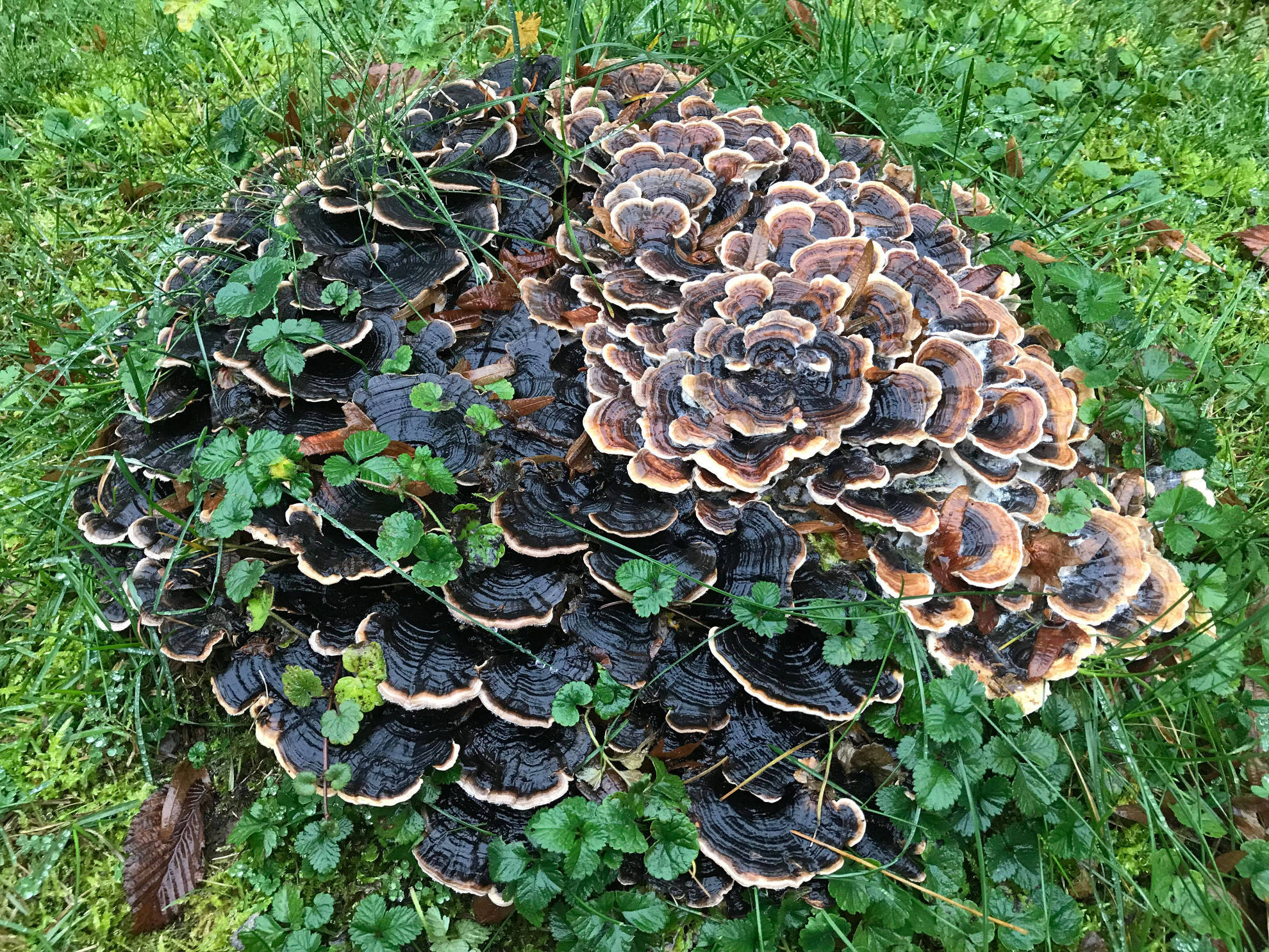 Jetzt wachsen dort diese wunderschönen Pilze draus ... wie es scheint nach grober Recherche sind das Schmetterlings-Trameten - oder?