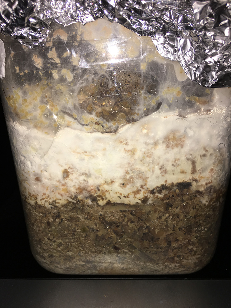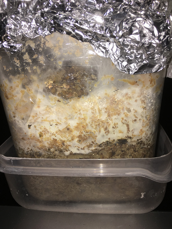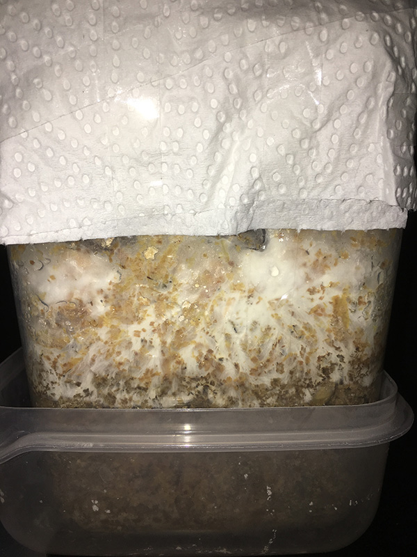 Bis jetzt sieht insgesamt sehr positiv aus. Falls es tatsächlich eine Konti war, scheint der Shiitake wirklich sehr widerstandsfähig zu sein. Mehr als die Hälfte des Behälters ist schon durchwachsen.