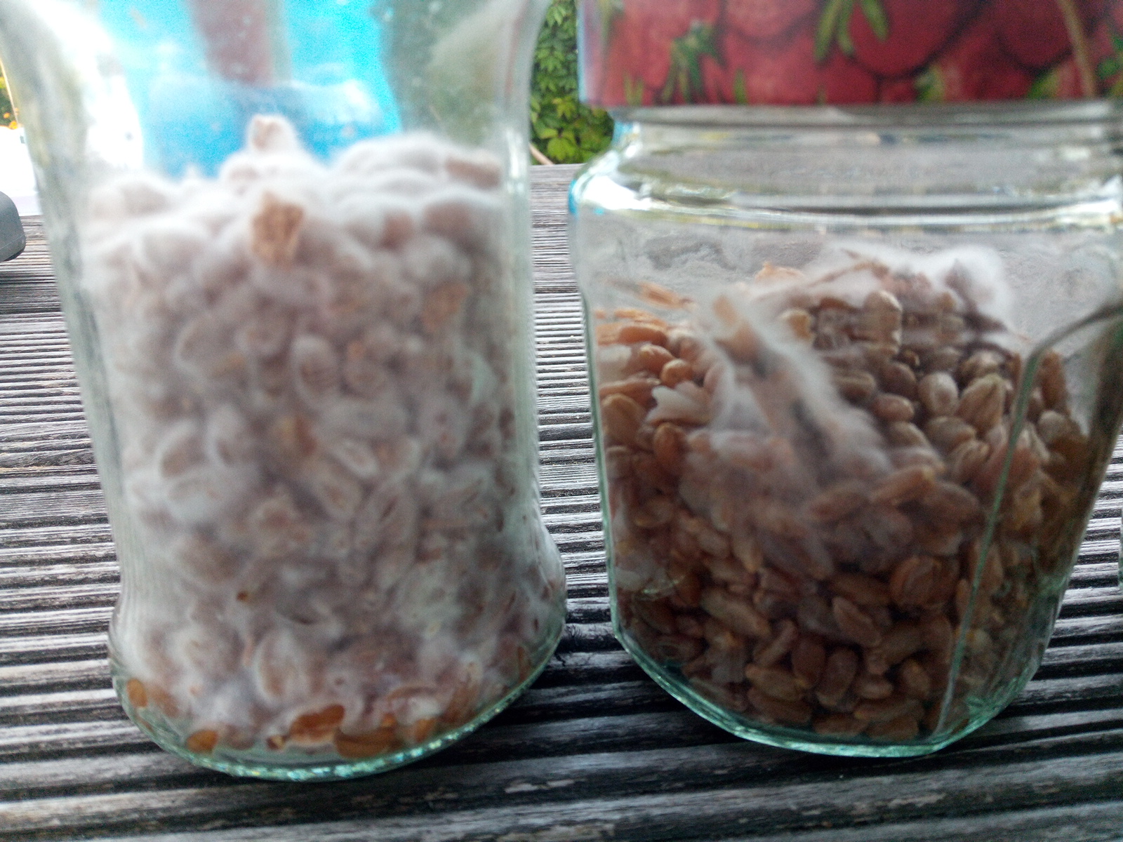 Also der Tip von Maria mit dem Schütteln (sanft) hat funktioniert - ich würde mal sagen, das ist prima Körnerbrut geworden ( links im Bild das selbe Glas vom Foto 9.7. oben)