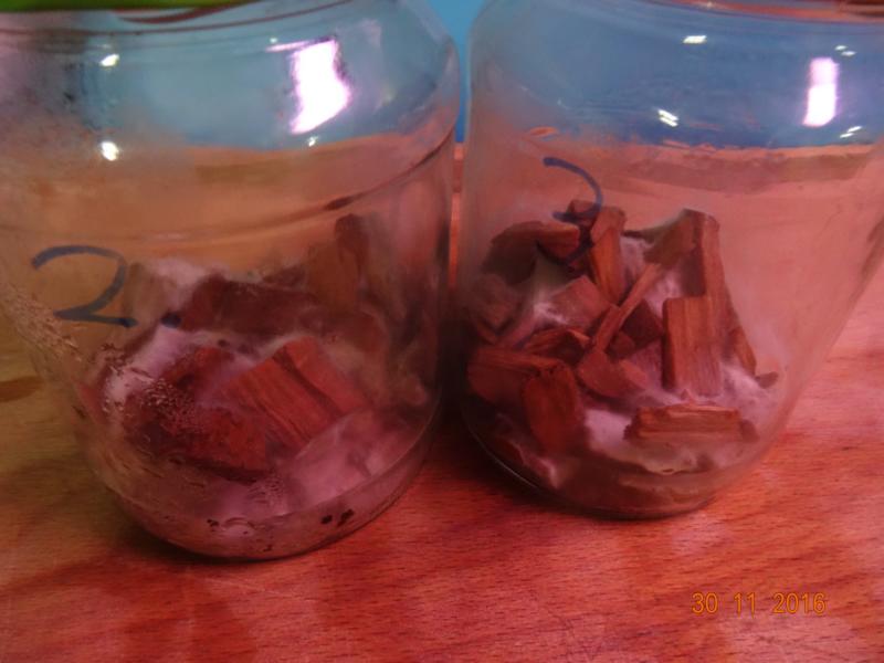 Wieder hab ich 6 Gläser mit je 3 dünnen Scheiben vom Stiel und 2 vom Fruchtfleisch auf Pappe "beimpft".