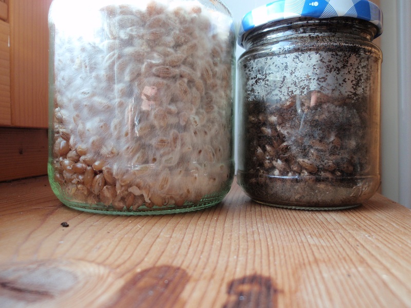 Samtfuß und Kräuterseitling brauchen beide noch etwas länger bis ich anfangen kann mehr Substrat zu beimpfen, hatten inzwischen auch schon zu wenig Luft und wurden umgedreht mit leicht geöffneten Deckeln. Inzwischen habe ich alle neuen Gläser mit Filtern ausgestattet, damit ich nicht extra den Deckel aufmachen muss