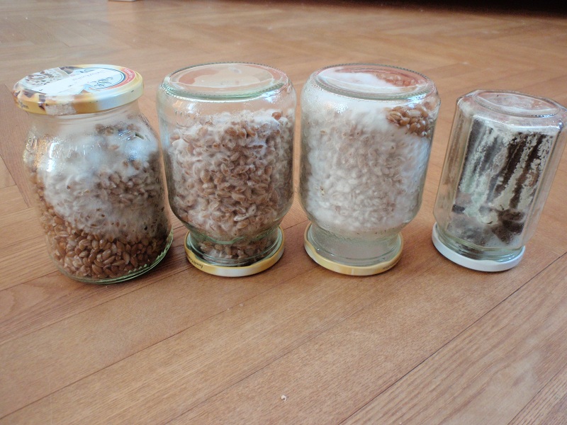 Die Winteraustern habe ich schon gut am wachsen und die Gläser mit steriler Pappe habe ich schon verwendet um einige Gläser mit Aststückchen und Buchendübeln zu impfen. Auf den direkt gemachten Roggenklonen sind sie durch die 500ml Gläser auch fast durch.