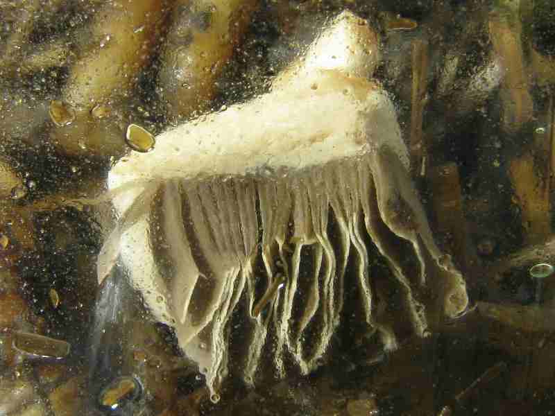 Heißt das die Lamellen wachsen weiter, bzw. wachsen im Gegensatz zum sonstigen Hut Gewebe?Das braune im Zentrum sind die Lamellen, die inzwischen viel größer sind, als das Hutgewebe, an dem sie hängen.