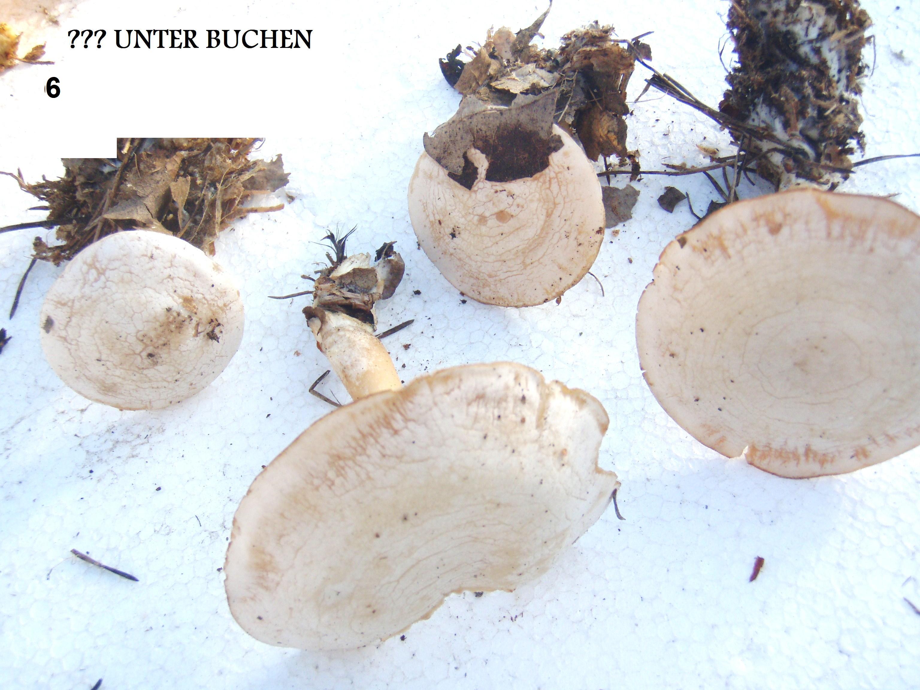 1. Kalkiger kleiner Pilz auf Bucherstreu(Bilder 5 u. 6) Hut ca 8cm Höhe ca 10cm keine Idee!!