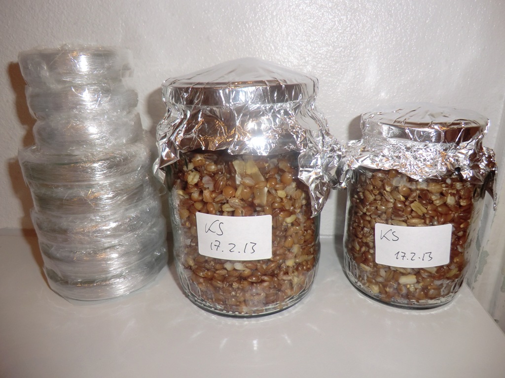 Allen Rest hab ich in zwei Gläser verteilt. Sicher 1/4 Petri mit Myzelagar auf ein Glas.