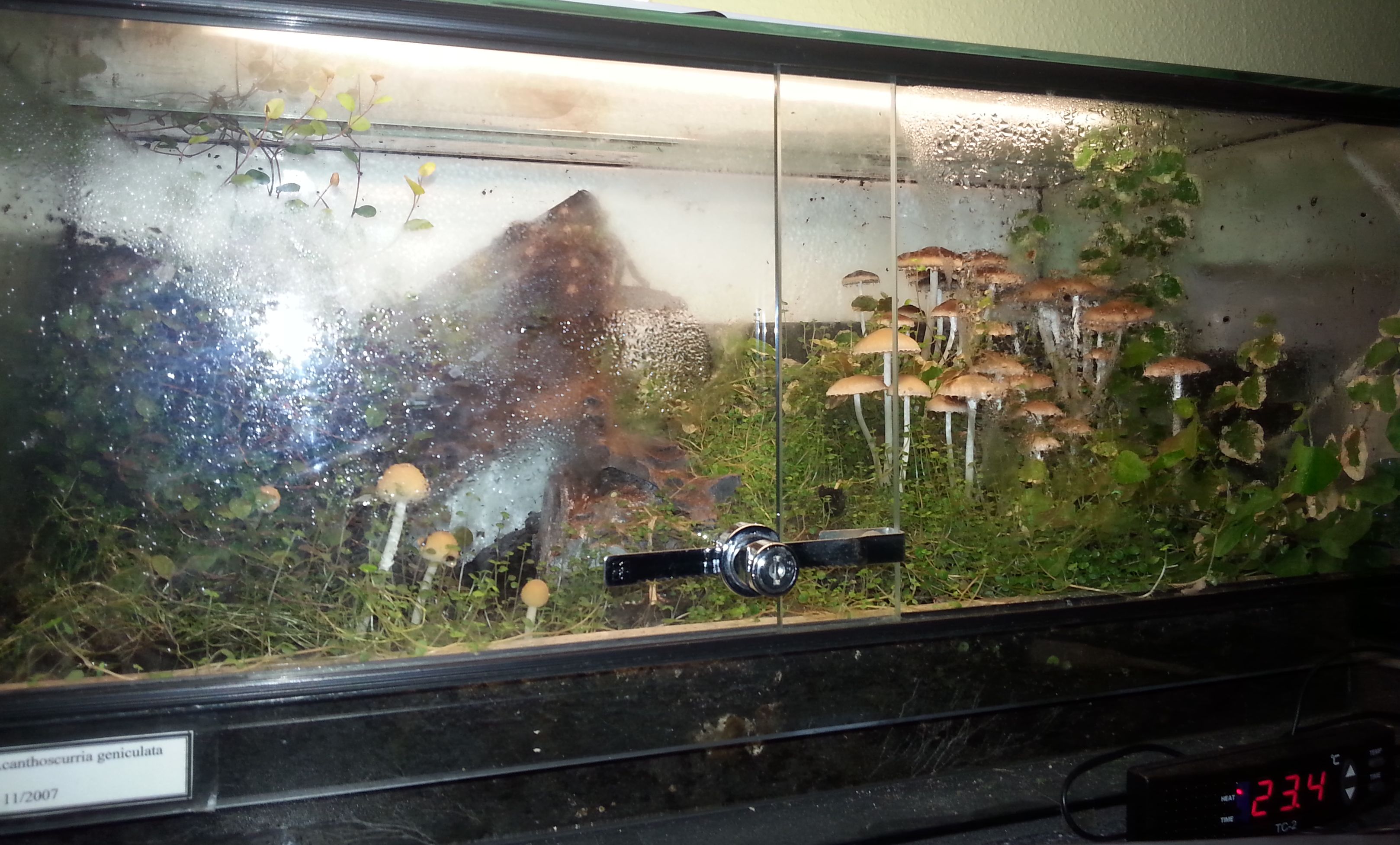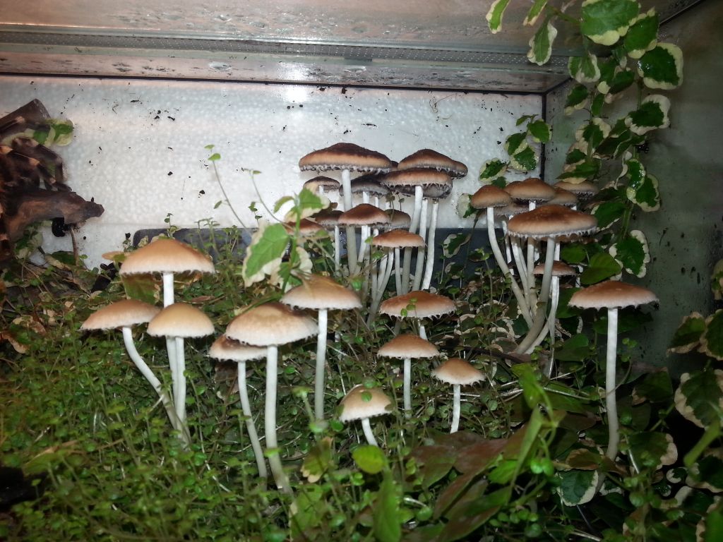 das hier ist leider nur ein Handyfoto und die Pilze sind auch nicht die selben sondern die Vorgänger von denen heute, aber man sieht ein bisl die Relation im Verhältnis zum Terrarium. Und auch wie feucht es da drin ist. Die Temperatur liegt immer zwischen 23 und 25°C, das scheint den Pilzen zu gefallen.