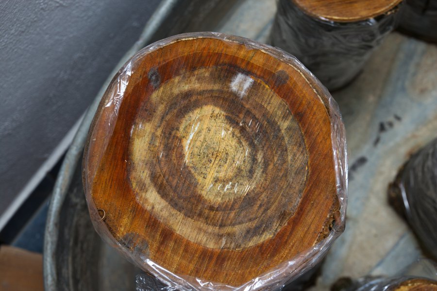 Abb. 1 zeigt die vor etwa einem haben Monat beimpften Stämme. Die Hölzer stammen von einem frisch geschlagenem Kirschbaum und wurden vor dem beimpfen 2 Tage gewässert. Sie stehen derzeit im Heizungskeller bei etwa 20 °C und wurden in Frischhaltefolie eingeschlagen.