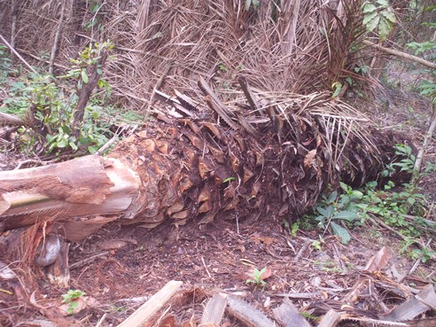 * In die Hacktaschen von noch stehenden / lebendigen Ölpalmen mit einem Stock Löcher bohren, Pilzstücke hineingeben und mit Lehm verschließen. Der beste Zeitpunkt ist unbekannt, gefühlt denke ich 6 Monate bis 2 Jahre vor dem Fällen. Auch frisch gefällte Ölpalmen kommen in Frage.