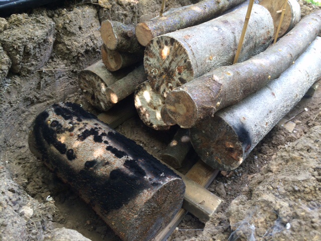 habe im Mai 2015 meine Buchen- und Eichenstämme mit Reishi, Shiitake und Igelstachelbart über Dübeln geimpft: Vorher die Stämme 24 Stunden gewässert, 5 bis 10 cm von den Stirmseiten abgeschnitten, Dübelstellen und Stirnseiten mit Latexmilch verschlossen und dann in die Miete gelegt. Die Luftfeuchte liegt etwa zwischen 80 bis 90%, die Temperatur zwischen 18 und 25 Grad Celsius.