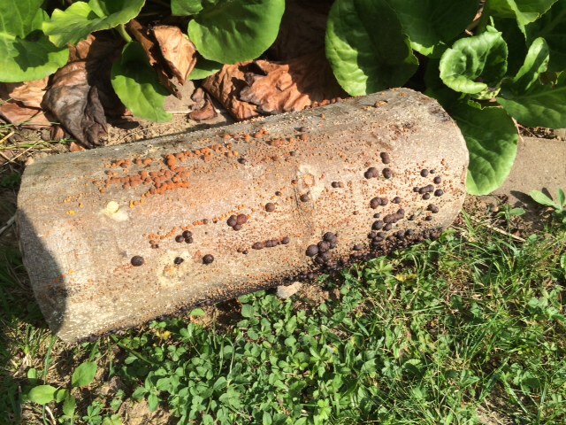 Die Stämme entwickeln sich ganz positiv. jedoch zeigten sich auf den Buchestämmen bald rote "Pustelpilze". In einem meiner Bücher "Nicola Krämer; Jutta Grimm: Shiitake und Austernpilze - Anbau im eigenen Gärten, Vegetarische Rezepte; Pala Verlag; Darmstadt, 2002" steht, dass man sich keine Sorgen machen muss, da sie auch wieder verschwinden. Jetzt sondern die Pilze aber massiv schwarzen Sporenstaub ab und ich mache mir doch Sorge, dass die ganze Miete damit infiziert wird.
