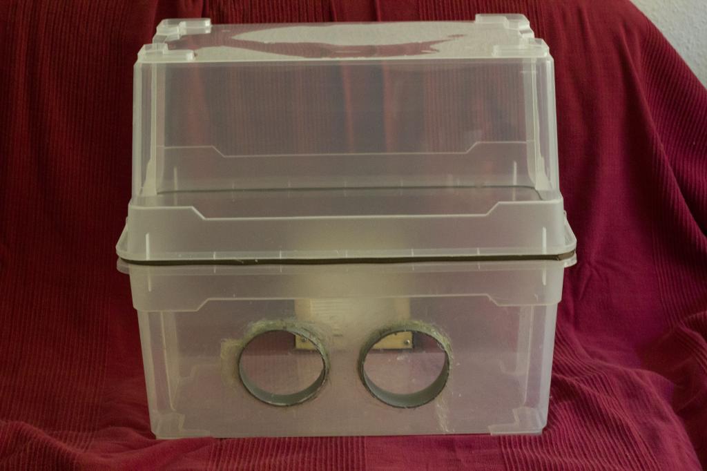 Werkzeuge, desinfektionsmittel und pilzzeug reinstellen. Deckel drauf! Staubsauger anschliessen und mit blasfunktion anmachen. Saugen geht nicht mit diesem aufbau! Haende desinfizieren und durch die oeffung fuehren. Von innen alles desinfizieren. Dann die arbeiten erledigen die steril sein muessen.