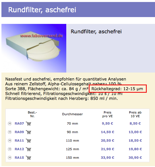 Zu Filtermaterialien: Es gibt Rundfilter aus Cellulose, PE, Glasgeflecht und Nitrocellulose. Laborkram gibt es einigermaßen erschwinglich bei Carl Roth oder bei Hartenstein (www.laborversand.de).