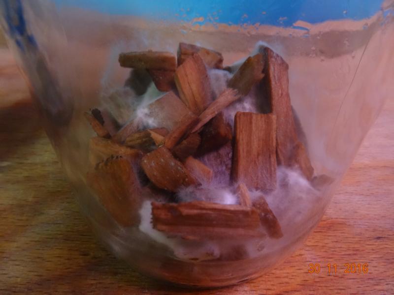 Wieder hab ich 6 Gläser mit je 3 dünnen Scheiben vom Stiel und 2 vom Fruchtfleisch auf Pappe "beimpft".