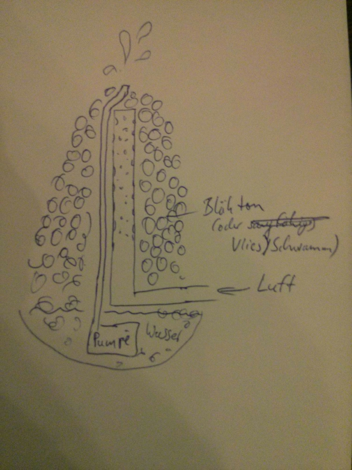 Also: z.B. Abflussrohr 50 mm mit vielen kleinen Löchern versehen, wo später die Luft durchströmen soll. Da drüber dann einen Filtervliesschlauch drüber ziehen oder ein Vlies drum wickeln, es muss aber genügend Luft durchkommen können. Den Wasserschlauch, der das Wasser vom Vorratsbehälter unten nach oben transportiert, könnte man auch durch das Abflussrohr ziehen, müsste man nur gut abdichten.