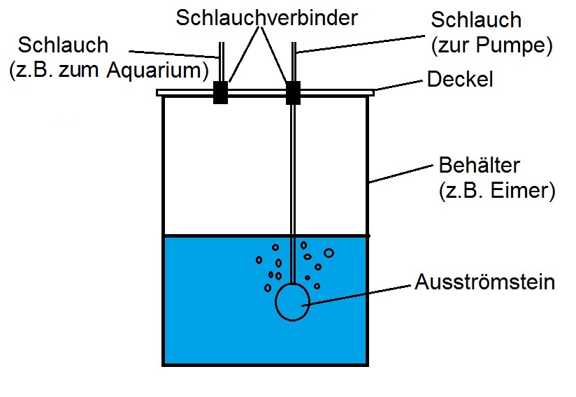 Kleiner Tipp: verwende einen verschließbaren Behälter (z.B. Eimer mit Deckel) und klebe, z.B. mit der Heißklebepistole, 2 Schlauchverbinder in den Deckel. Den einen verwendest du um den Ausströmstein Luft über einen Schlauch zur Pumpe zuzuführen, den anderen um die Luft über einen Schlauch zu deiner Fruchtungskammer/box/etc zu leiten. Dadurch schmoddert dir dein Wasser (und damit auch dein Ausströmstein) nicht so schnell zu, wodurch auch die feuchte Luft sauberer ist. Ansonsten würde dir die Pumpe nur kontaminiertes Wasser im Raum verteilen. Weiterer Vorteil: du nimmst in deiner Kammer keinen Platz weg, weil du Pumpe+Behälter auch ausserhalb lagern kannst. Hier ein Bild, damit du dir besser vorstellen kannst was ich meine: