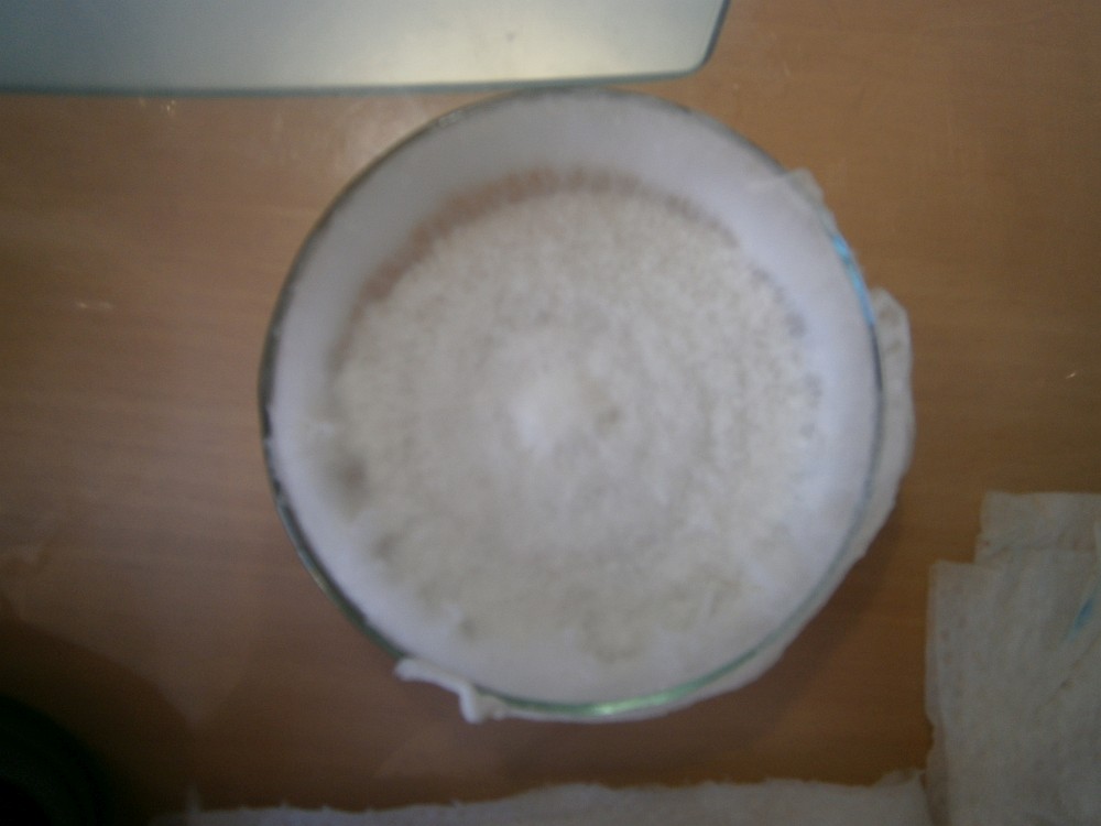 - ca. 20g Agar wurden in 300ml lauwarmen Wasser eingerührt und die Lösung/Suspension in kochende Nährlösung eingerührt