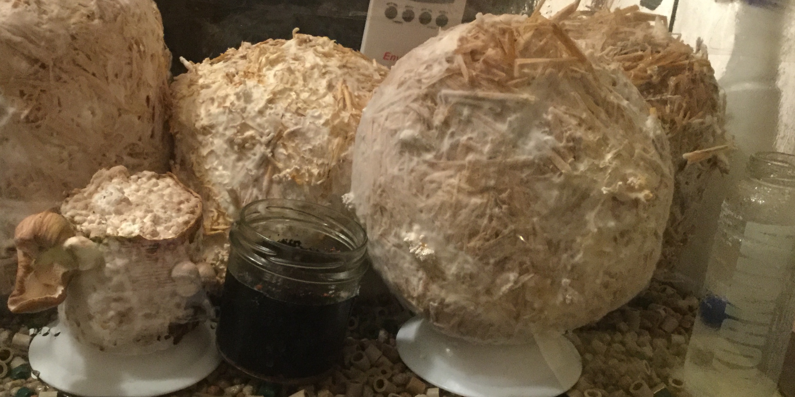 Kann schon sein dass denen die Puste ausgeht, ich glaube aber ehr dass die zu wenig Wasser haben, da der Pilz welcher an der Scheibe anliegt deutlich weiterwächst, während die andern verkümmern...