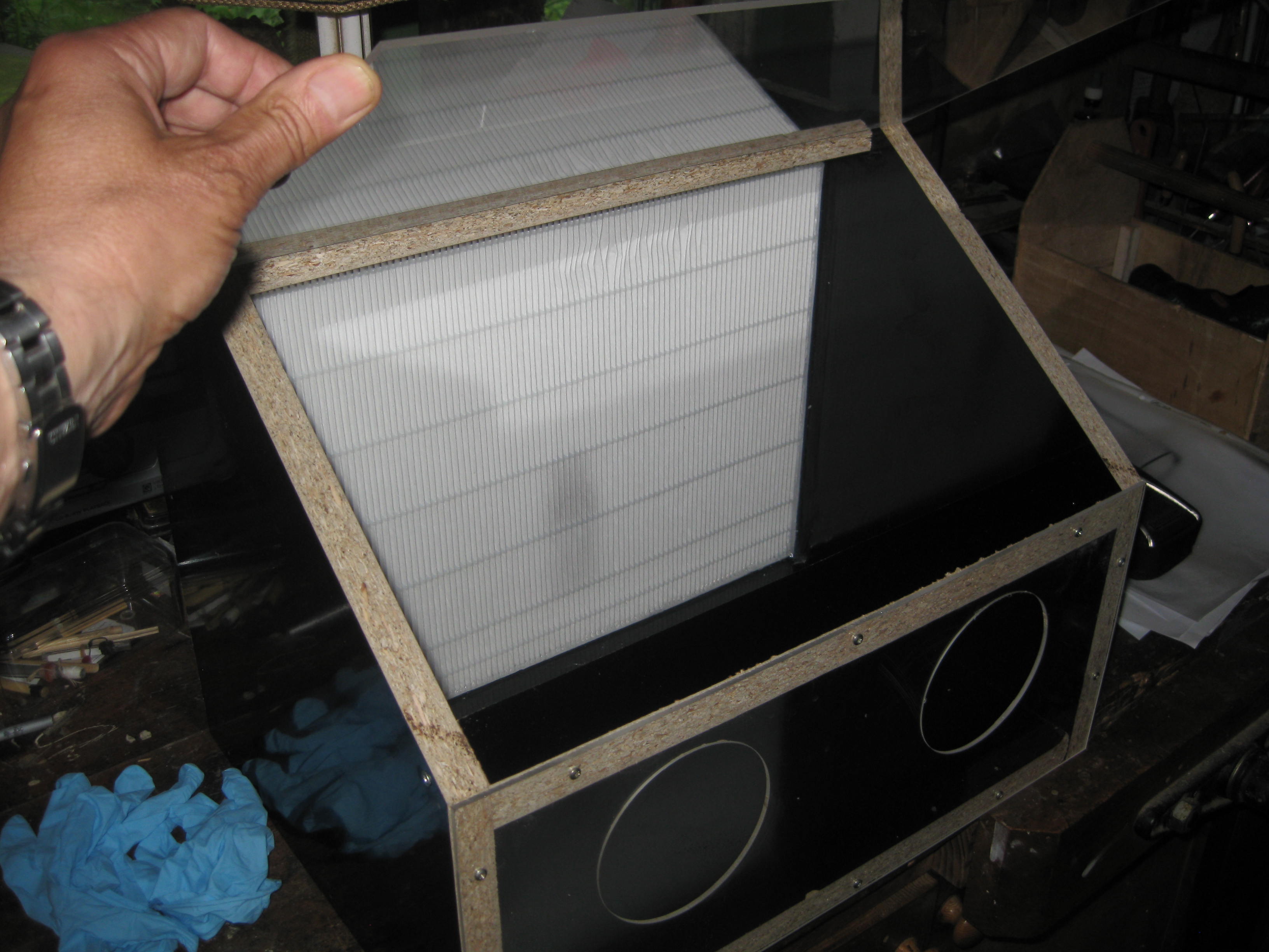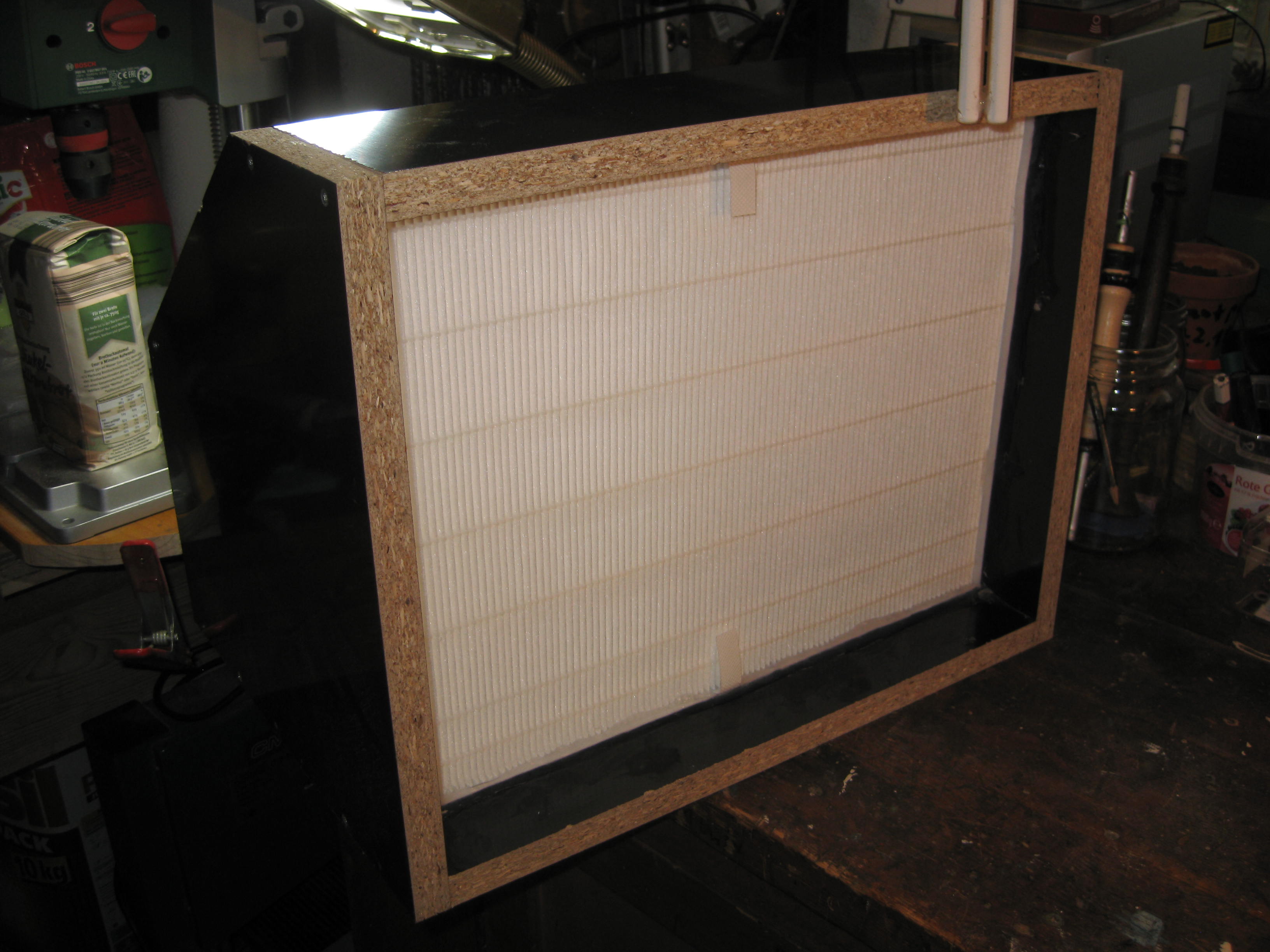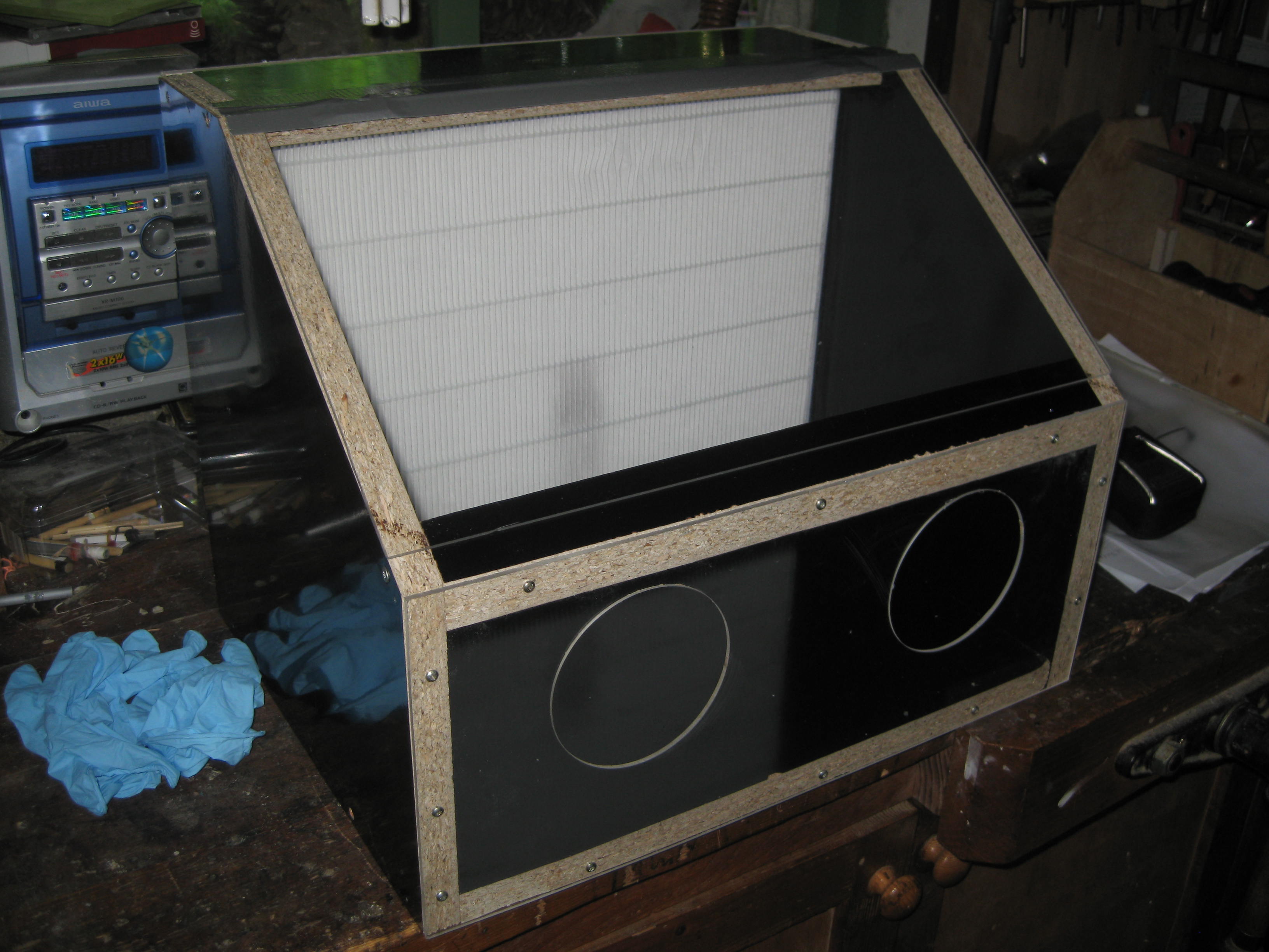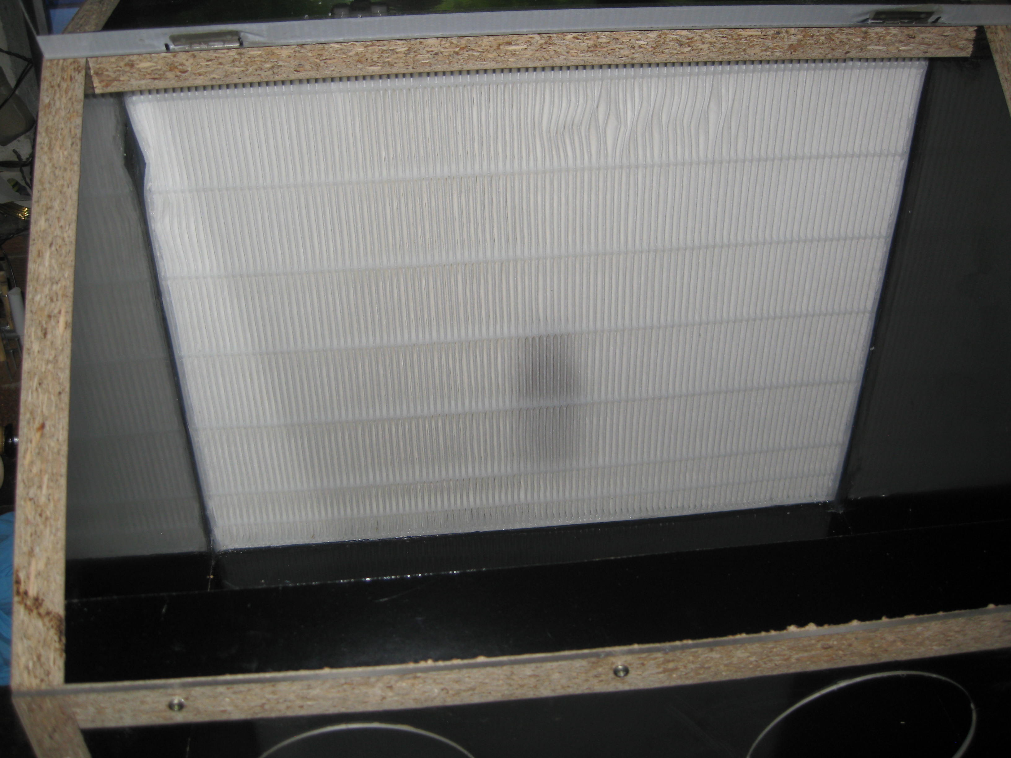 Habe vor kurzem eine preiswerte Impfbox gebaut aus Pressspanplatten- und Plexiglasresten aus dem Baumarkt. HEPA-Filter in der Grösse ca. 41x32cm von Fellowes bekam ich von Fa. Telemedia 3000Ltd. , Kosten: 29.94€.Dieses habe ich mittels Silikon im Gehäuse festgeklebt und die rückwärtige Gebläsekammer somit abgedichtet. Auf ein Vorfilter habe ich wegen der kurzen Benutzungszeiten verzichtet (Filtereffektivität ist mit 99,97% angegeben, das reicht!).