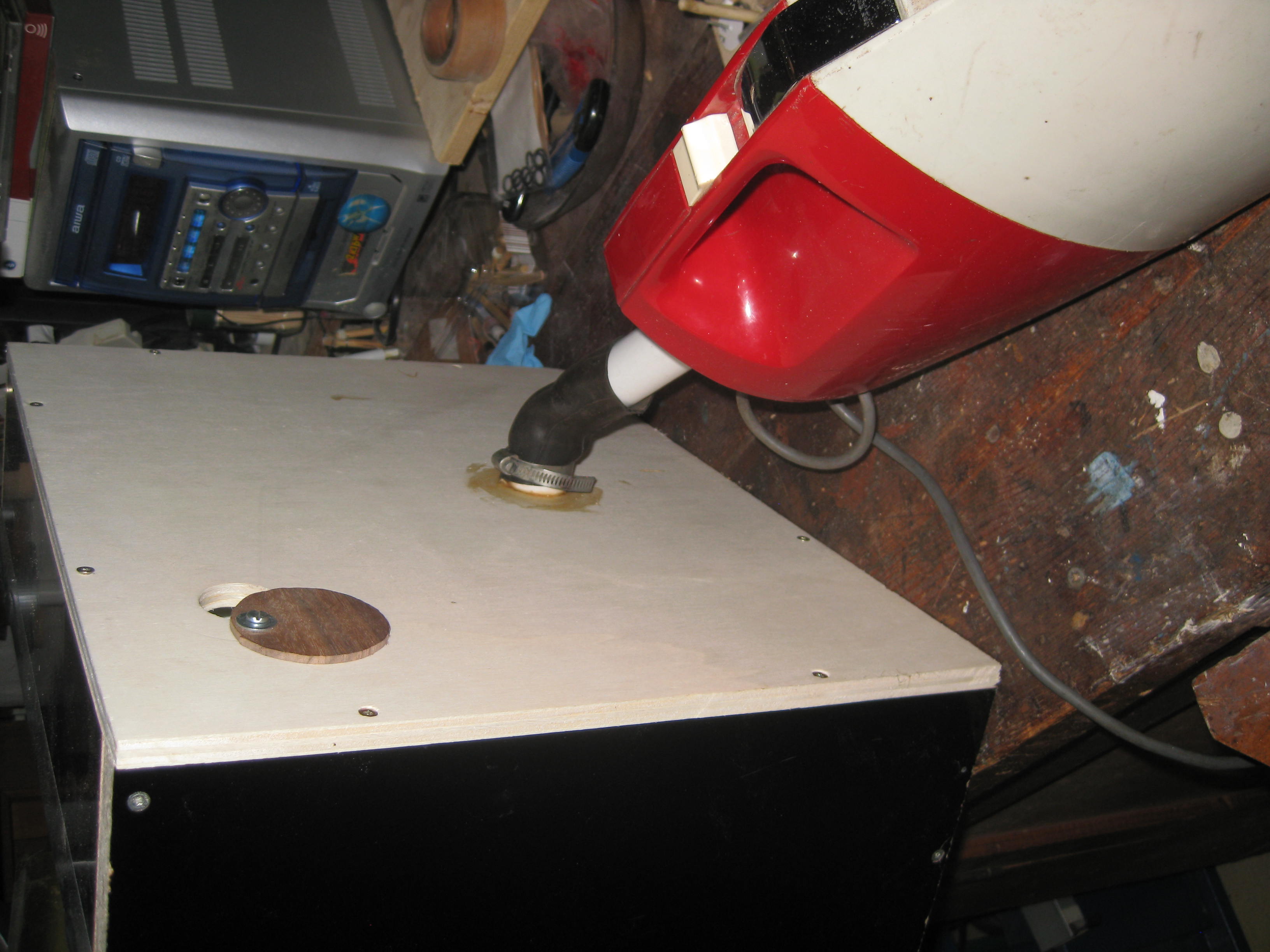 Als Gebläse besitze ich einen alten Staubsauger den man auch als Bläser einsetzen kann. Die Bauform ist aus dem Anhang ersichtlich, kann nach eigenen Vorlieben geändert werden.