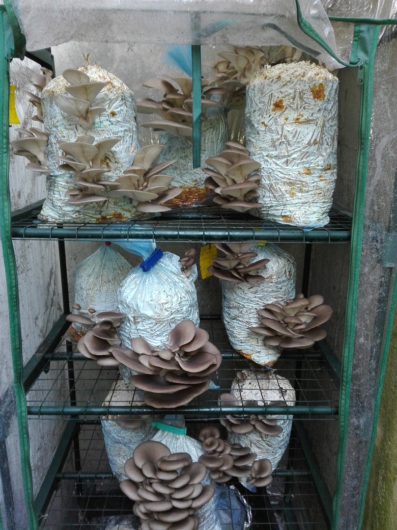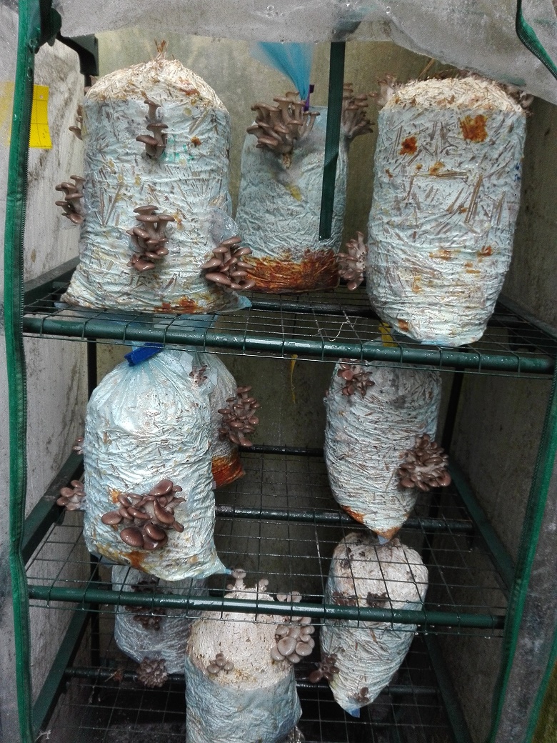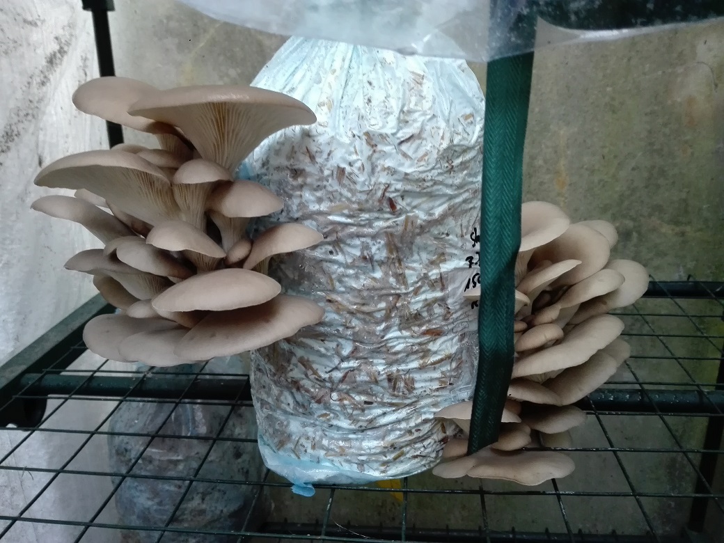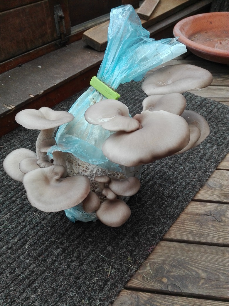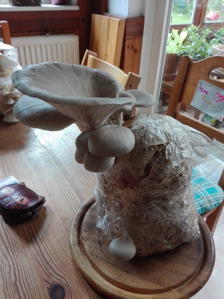 Hier sind ein paar Fotos von meiner Auster auf dem Substrat mit den Zutaten von Holzpellets, Strohpellets, Kleie, Buchenchips und Kalk sowie Gips.