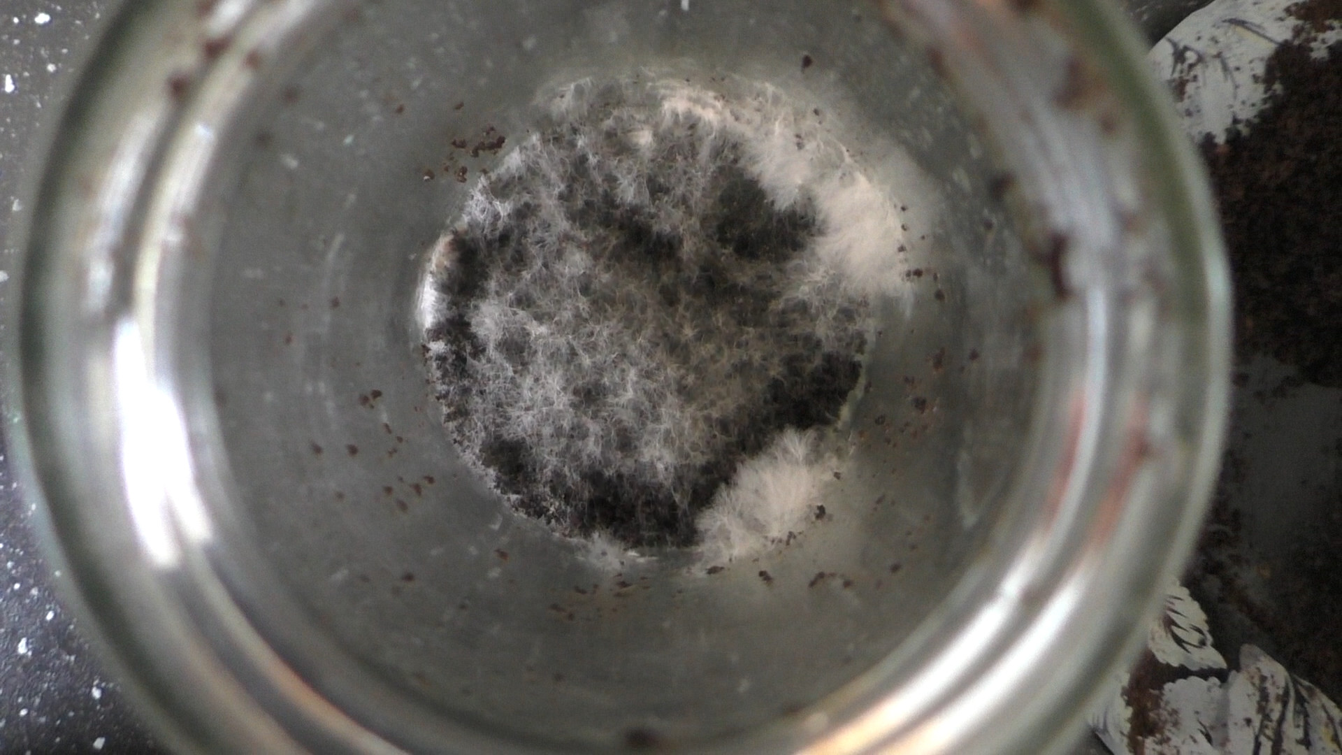 Ich habe vor Kurzem erst mit der Pilzzucht begonnen, und unter meinen ersten Versuchen war auch ein unsteril auf Pappe geklonter Austernseitling, den ich in einem Einmachglas schichtweise mit Kaffeesatz gefüttert habe. Gestern abend sah das Ganze noch so aus und ich habe zwei leicht gehäufte Esslöffel zuvor abgekochten feuchten Kaffeesatz hinzugefügt.