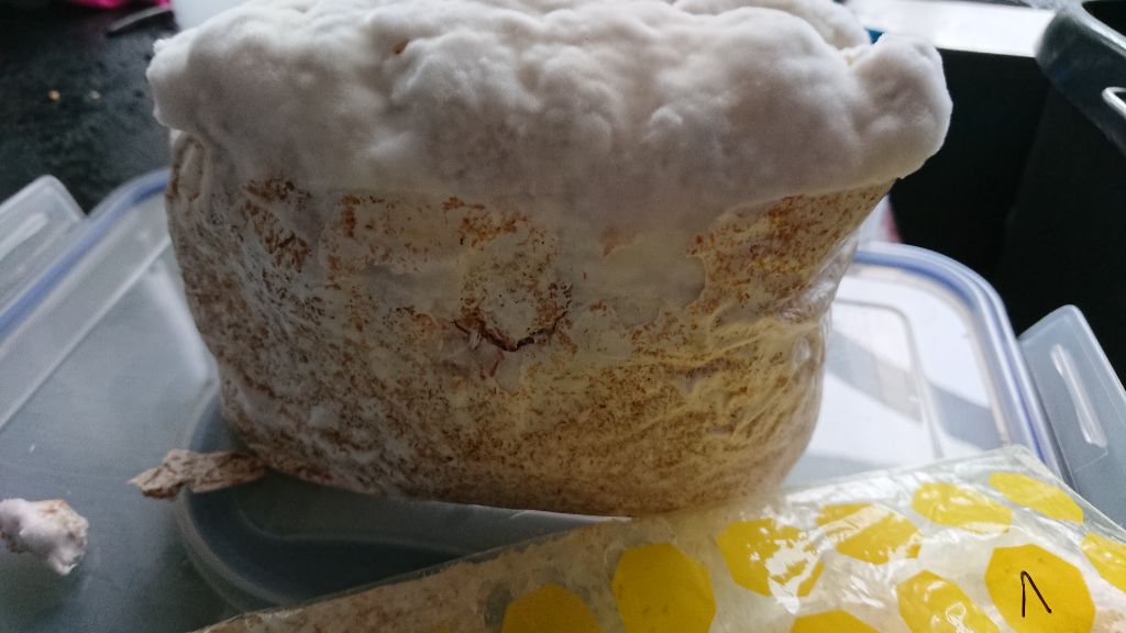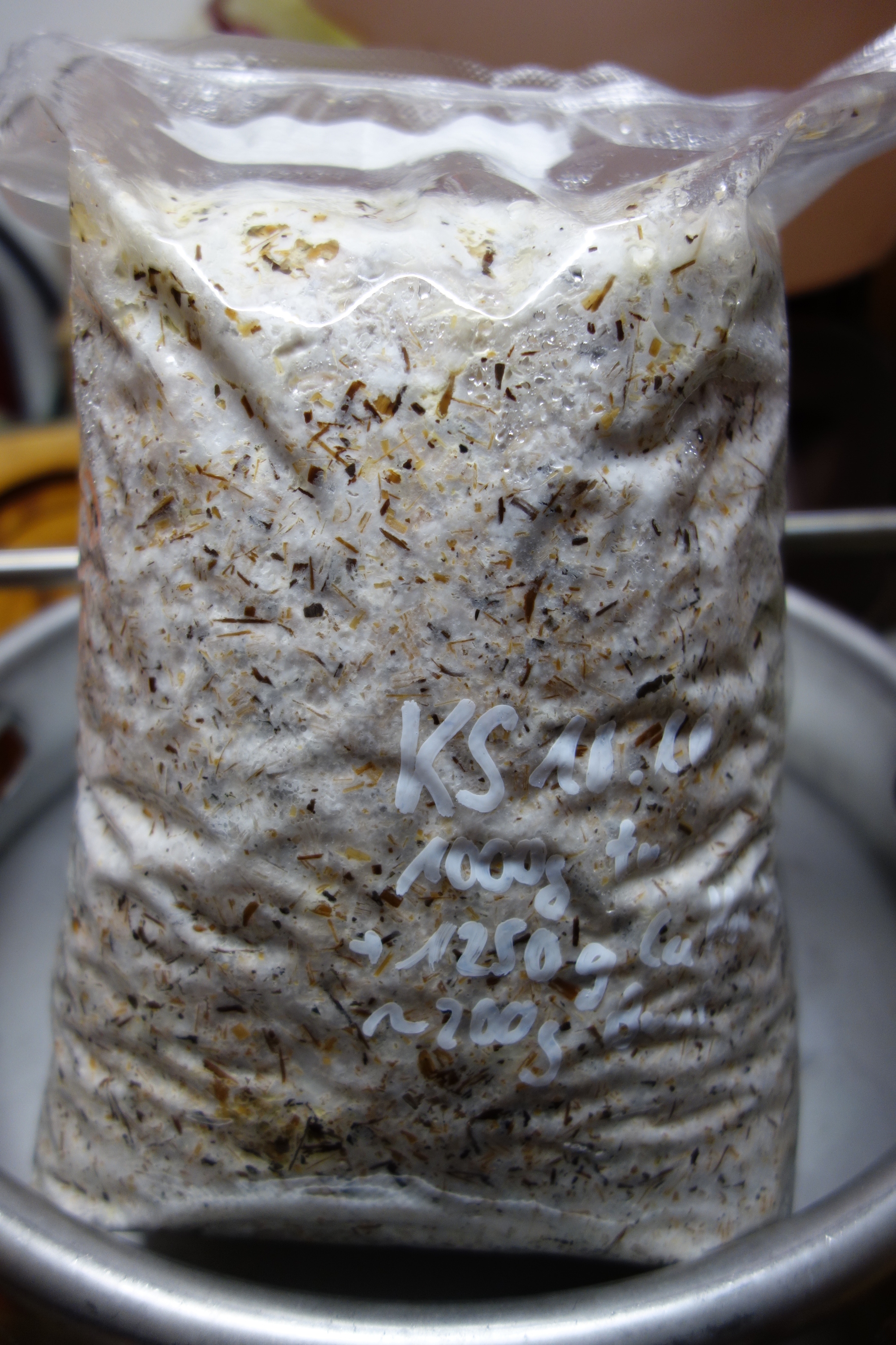 Diesen Block hatte ich am 18.10 beimpft. Durchwachsen war er wohl wie sonst auch nach gut ein bis zwei Wochen. Hatte ein wenig mit Schimmel zu kämpfen aber nicht viel. Wurde überwachsen. Hab ihn dann "gerieben", wie man das hald so macht um das Fruchten anzuregen und kühler gestellt (ca. 12 bis 15 °C) und geschlossen gelassen damit es schön feucht bleibt. Jetzt nach zwei Wochen zeigen sich erste Pins und es wird zeit den Block zu öffnen. Ich lasse dann oben einen "Kragen" stehen, damit sich CO2 sammelt und sie Stile länger werden. Wenn abgeerntet ist, kann man den Beutel dann wieder einschlagen und verkehrt herum aufstellen. Dadurch entsteht ein feuchtes Klima und es der Block wird wieder zum fruchten angeregt (dauert ein bis zwei Wochen i.d.R.). Allersings sind das nur recht dürftige Erfahrungen, hab erst drei oder vier Blöcke KS in Kultur gehabt.