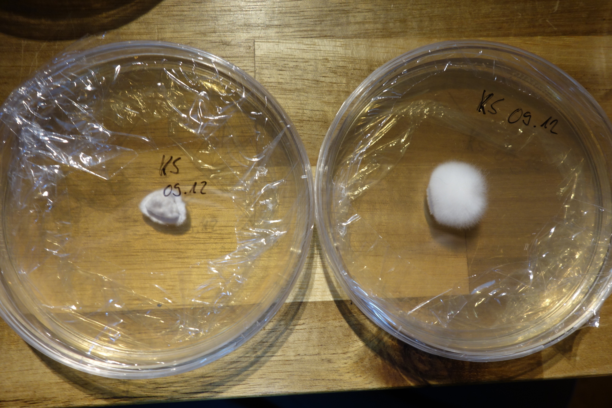 Einen Beutel habe ich nun in eine größere Plastikbox gestellt, sodass ich über 90% Luftfeuchtigkeit habe. Nun ist der ganze Block schneeweiß und "flauschig" überzogen und sonst tut sich nichts.