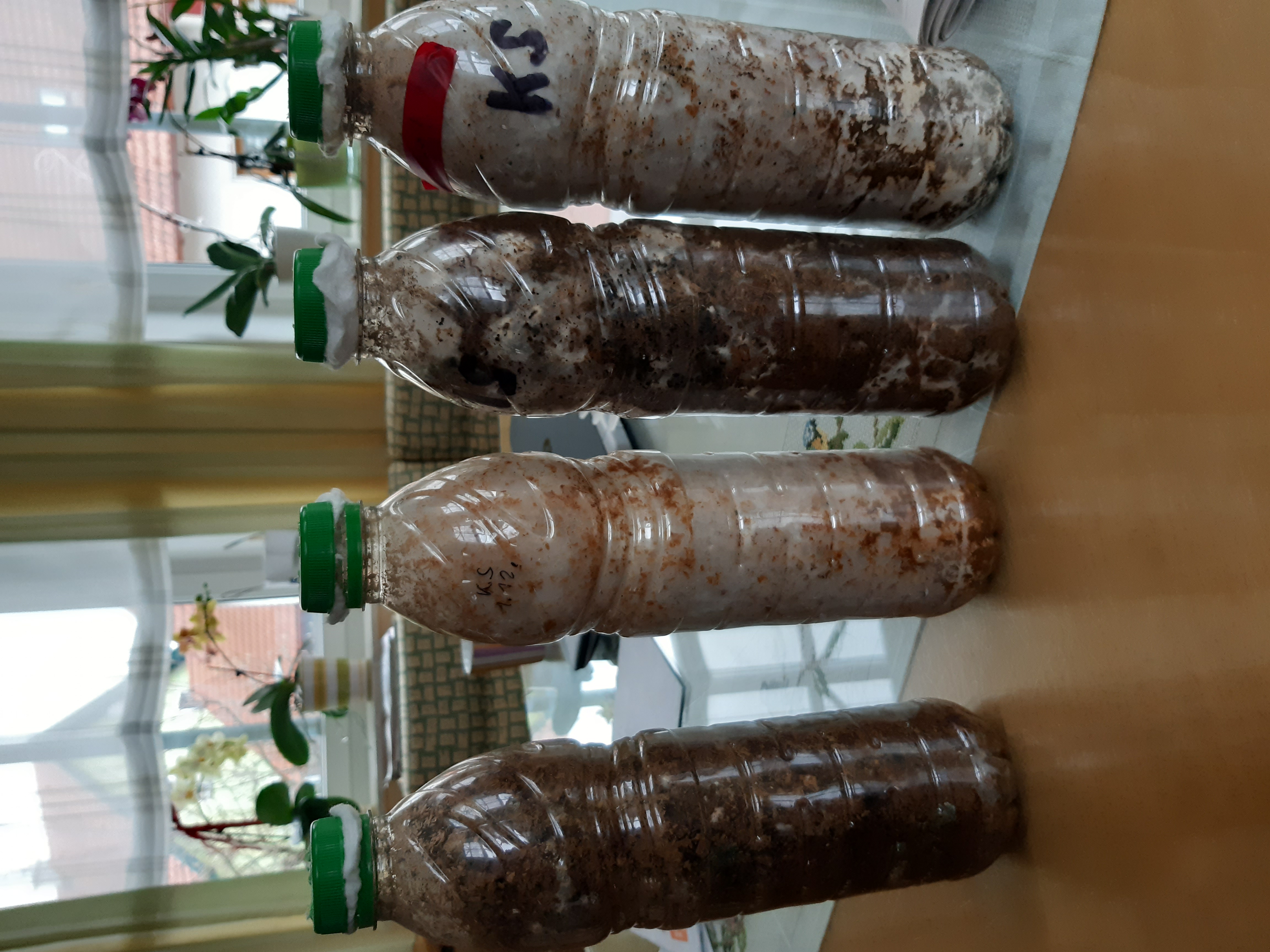 Mittlerweile habe ich geerntet. Das Ergebnis war ernüchternd. Einige fanden den Ausgang nicht :( . Aus einer Flasche kam dann einer, aus der anderen zwei KS. Sie wachsen unglaublich schnell. Nach einiger Zeit bemerkte ich weißen Belag un die Flasche, bus ich drauf kam, dass das die Sporen sind .
