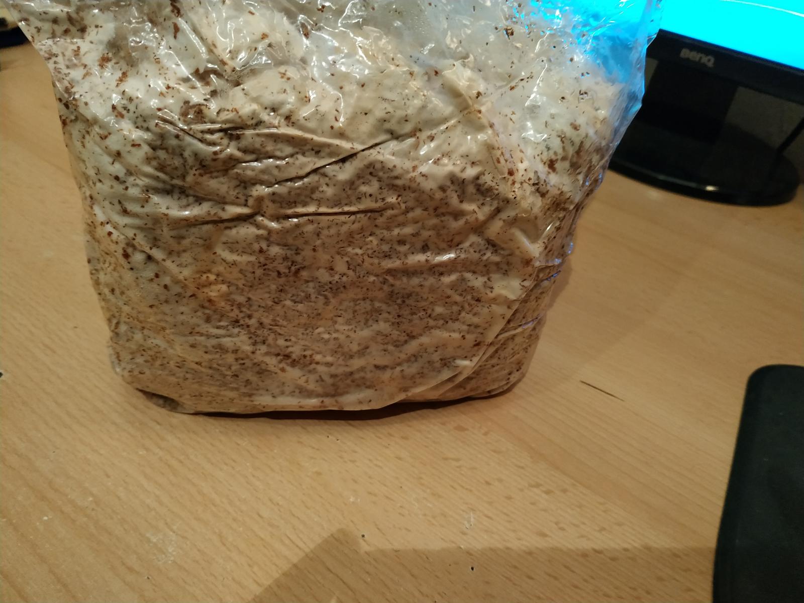 Nun habe ich zur Probe zwei Beutel in die Fruchtungskammer gestellt (die zwei ganz rechts auf dem Bild). Einen davon komplett geöffnet und einen mit Schlitzen versehen. Mal schauen ob was kommt.