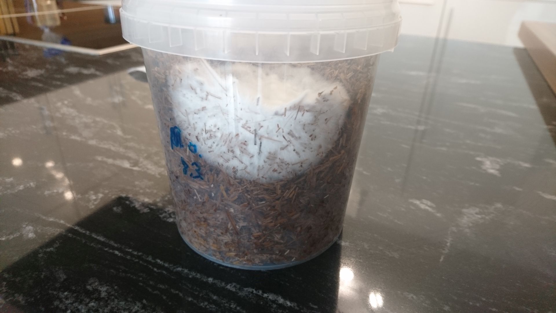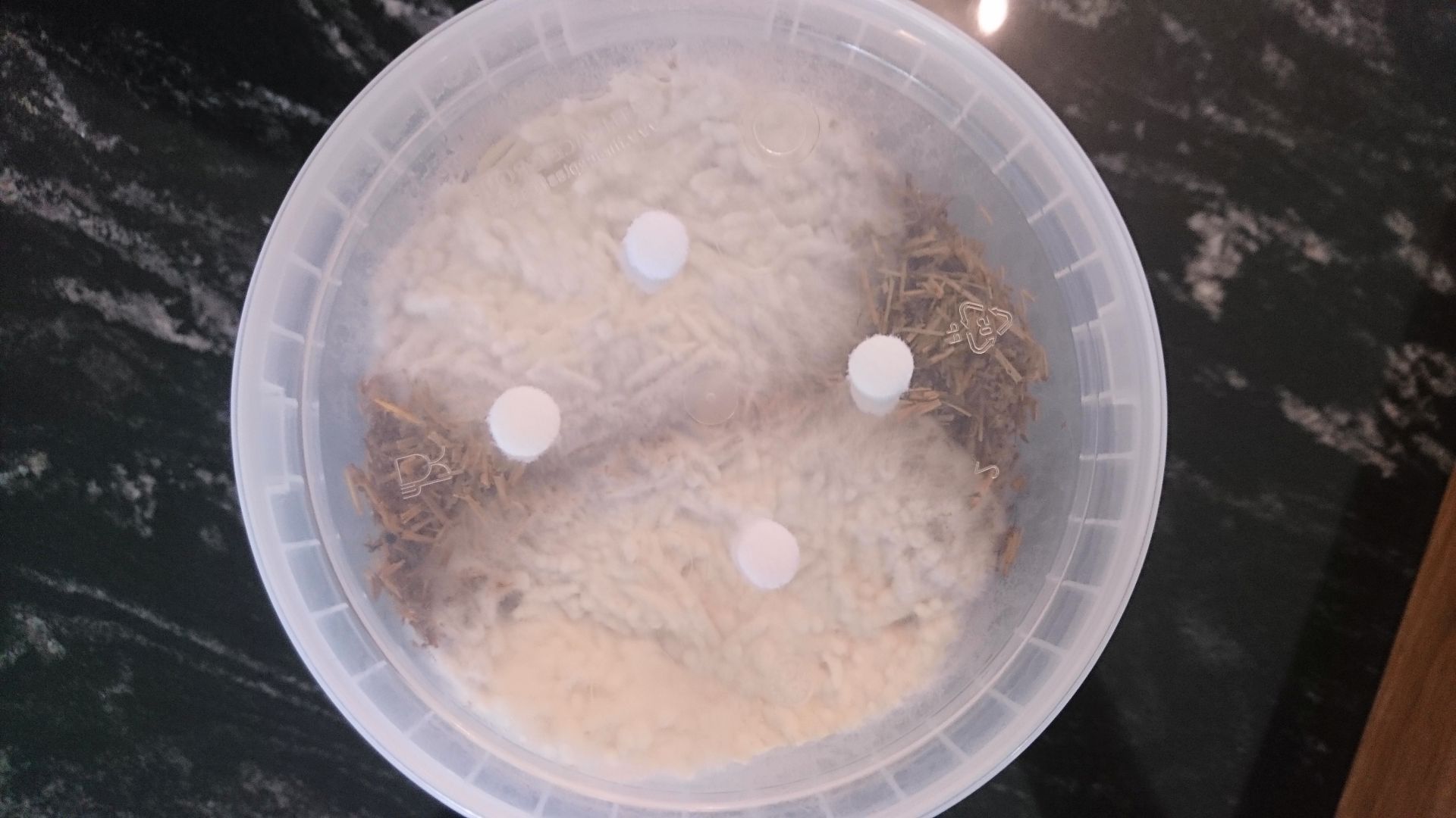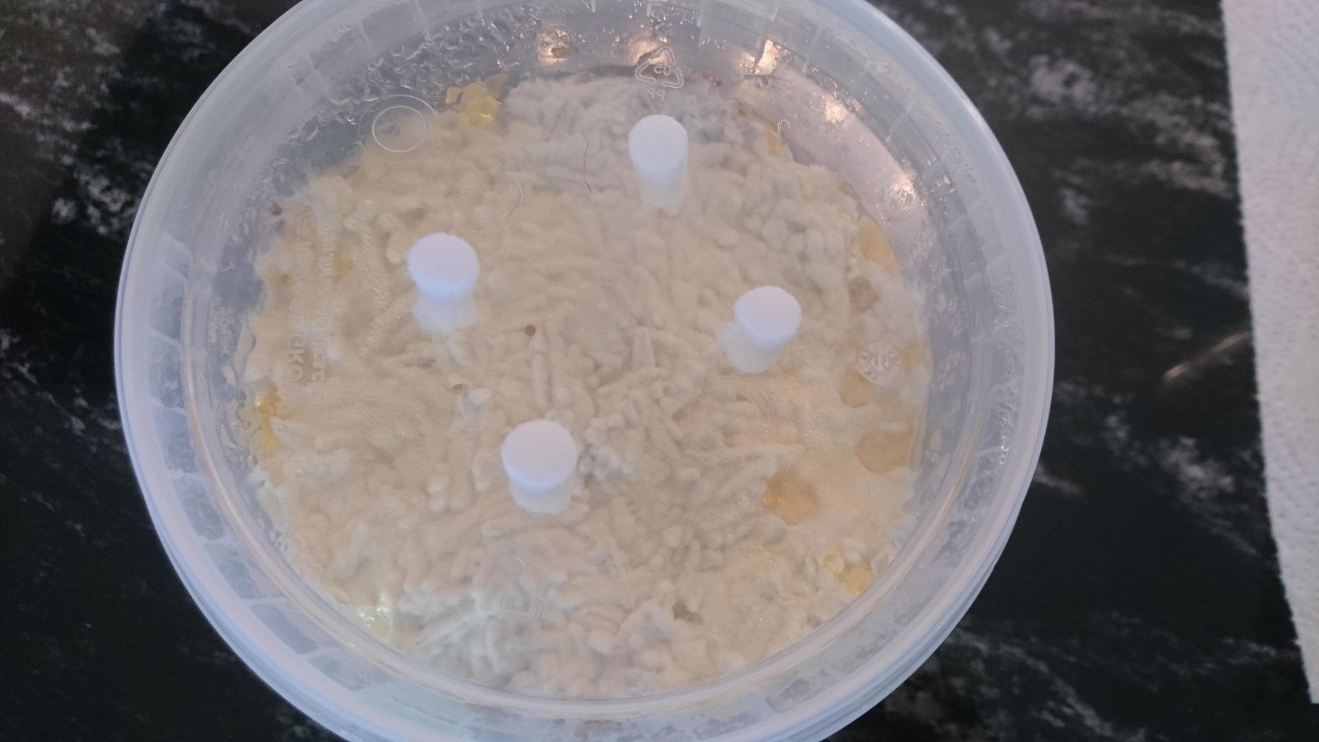 Nachdem er unten nur sehr langsam weiter wächst, vermutlich zu wenig Sauerstoff, habe ich den jetzt in eine Fruchtungsbox übersiedelt. Zudem Oberfläche etwas angekratzt und für 24h Wasser drauf.