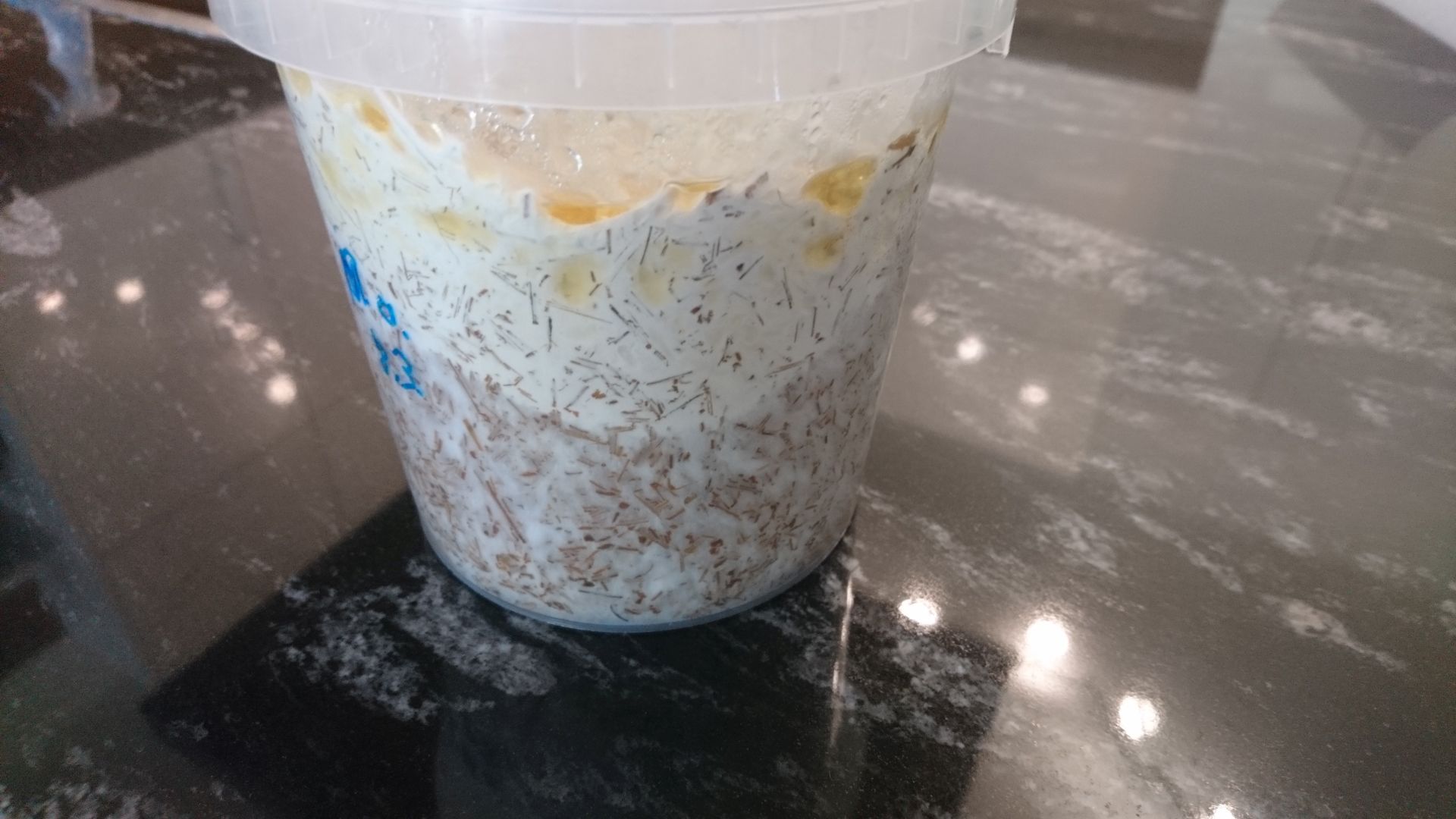 Hier eine Woche nach der Beimpfung direkt von Agar: Hier 2 Wochen nach der Beimpfung von Agar: Zuerst wuchs das Myzel eher dünn, dann hat es plötzlich massiv an Dichtheit zugelegt.