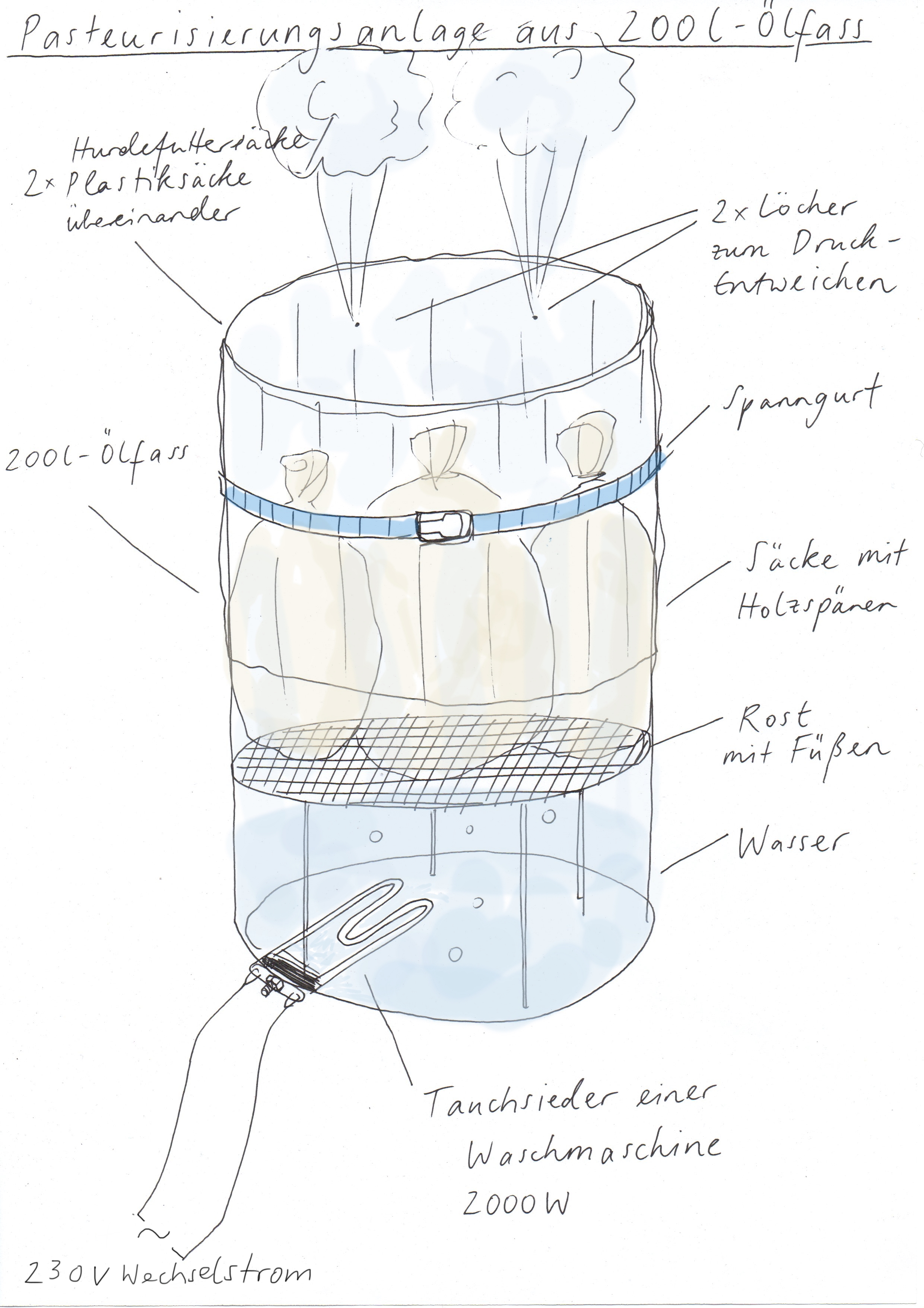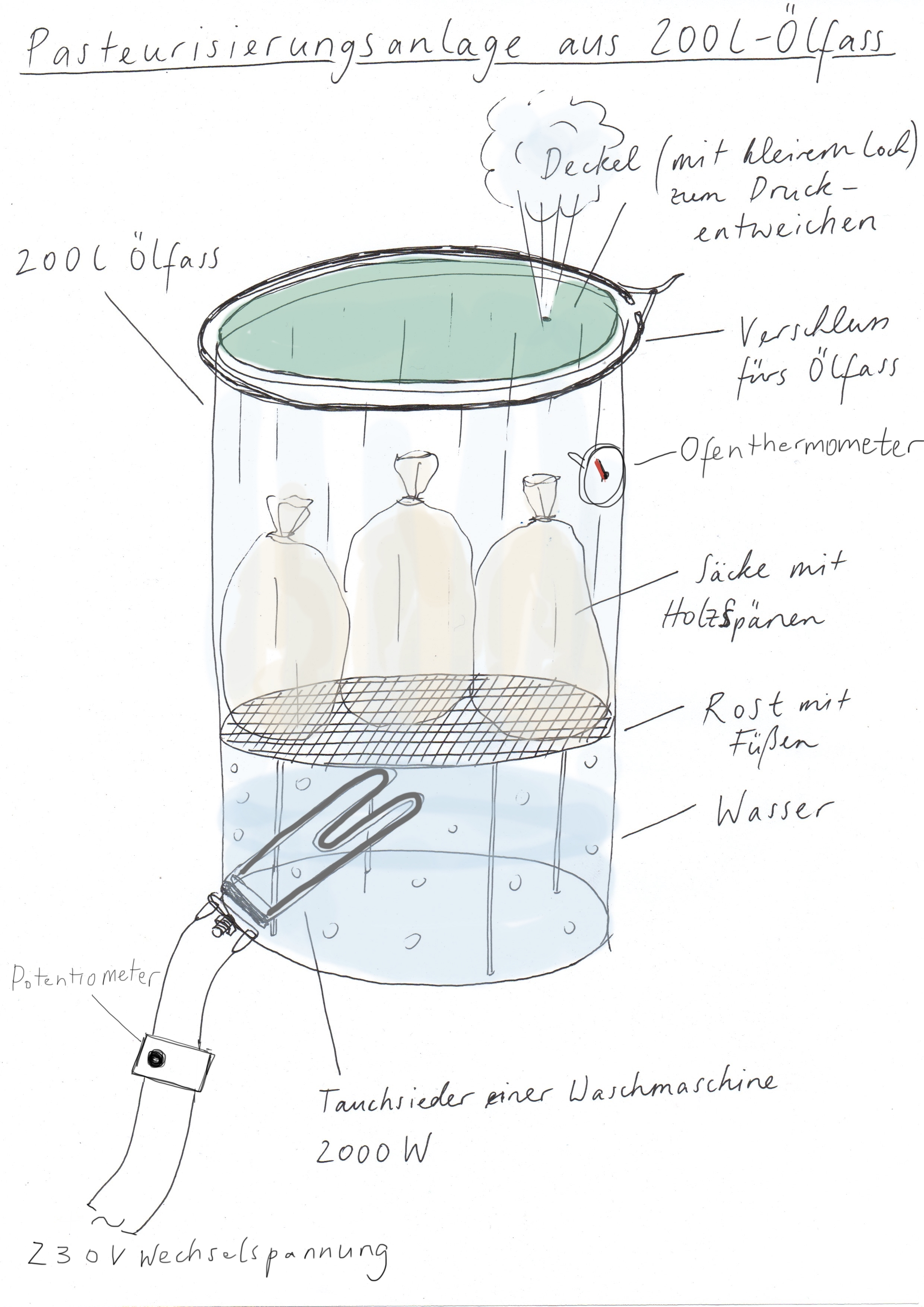 Ich habe ein Ölfass mit einem Deckel + Dichtung und einem ringförmigen Verschluss und kann deshalb auf die Lösung mit den Hundefuttersäcken verzichten. (siehe Foto vom Ölfass und Skizze 2). Marco pasteurisiert in diesem Gerät wie erwähnt Stroh mit Hilfe des entstehenden Wasserdampfes. Denkt Ihr das funktioniert mit Holzspänen genauso gut? Oder würdet Ihr die Säcke mit den Eichenspänen lieber schwimmend im Fass pasteurisieren? Was sind die Vorteile des Wasserdampfes gegenüber dem Pasteurisieren direkt im Wasser?