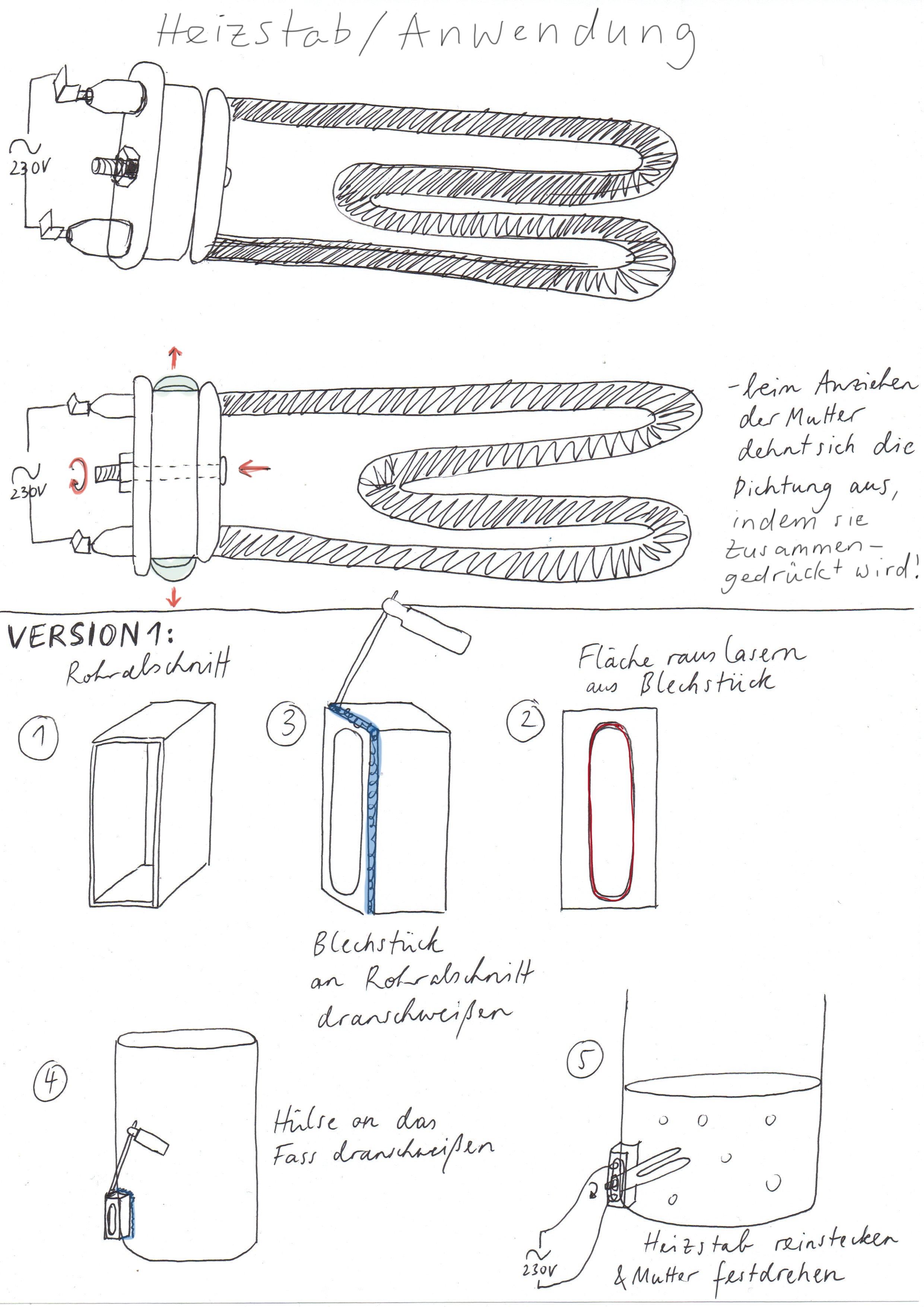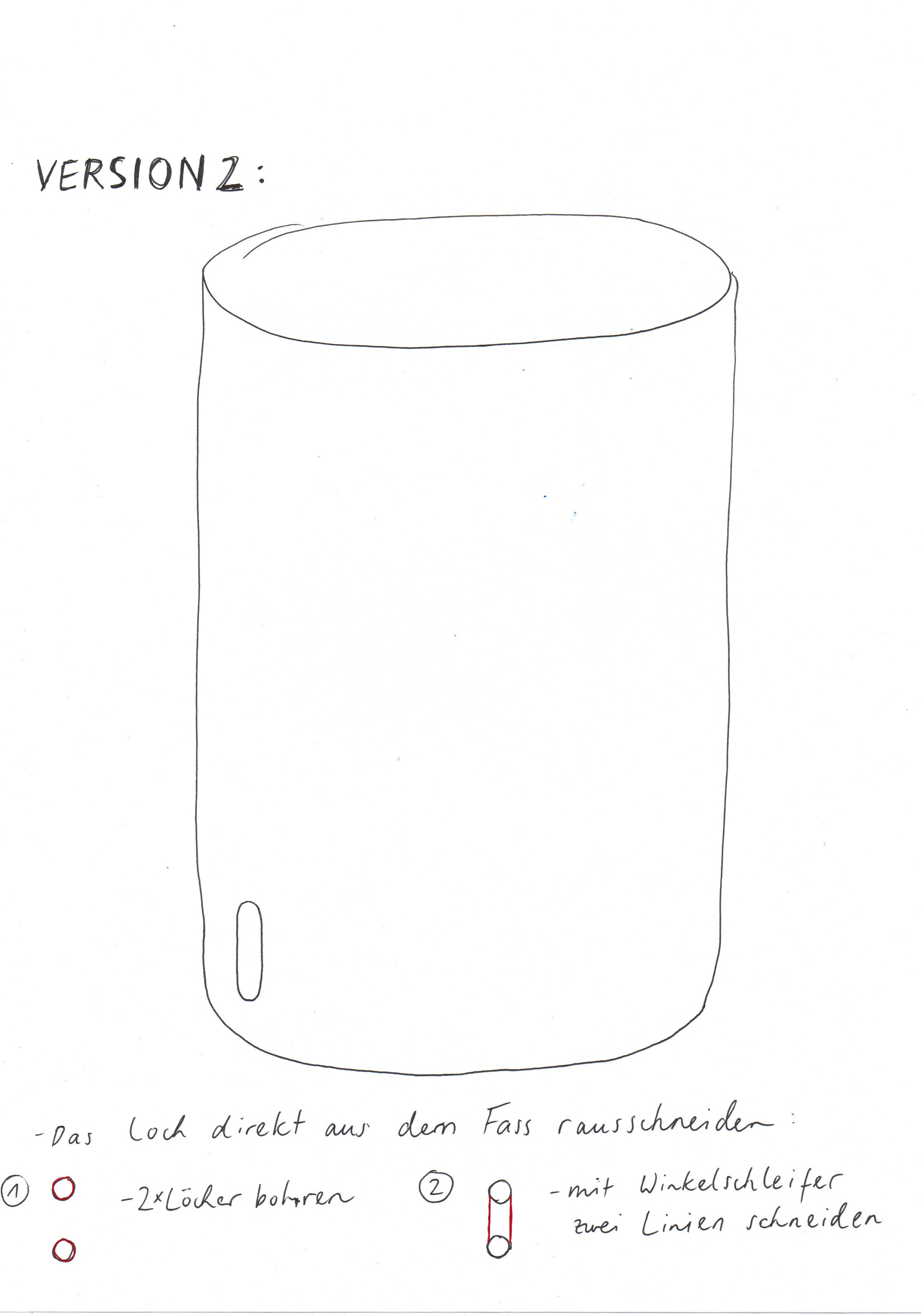 Version 2: Ich bohre und schneide die ovale Öffnung direkt aus dem Fass heraus und befestige den Heizstab darin. Hat irgendjemand von Euch schonmal ein ähnliches Pasteurisierungsgerät gebaut? Wie habt Ihr den Heizstab an dem Fass angebracht? Oder hattet Ihr ein Bauelement mit einer anderen Form? Falls Ihr so ein Gerät noch nicht gebaut habt, aber eine gute Idee dazu habt, seid Ihr auch herzlich eingeladen das hier zu posten!:)