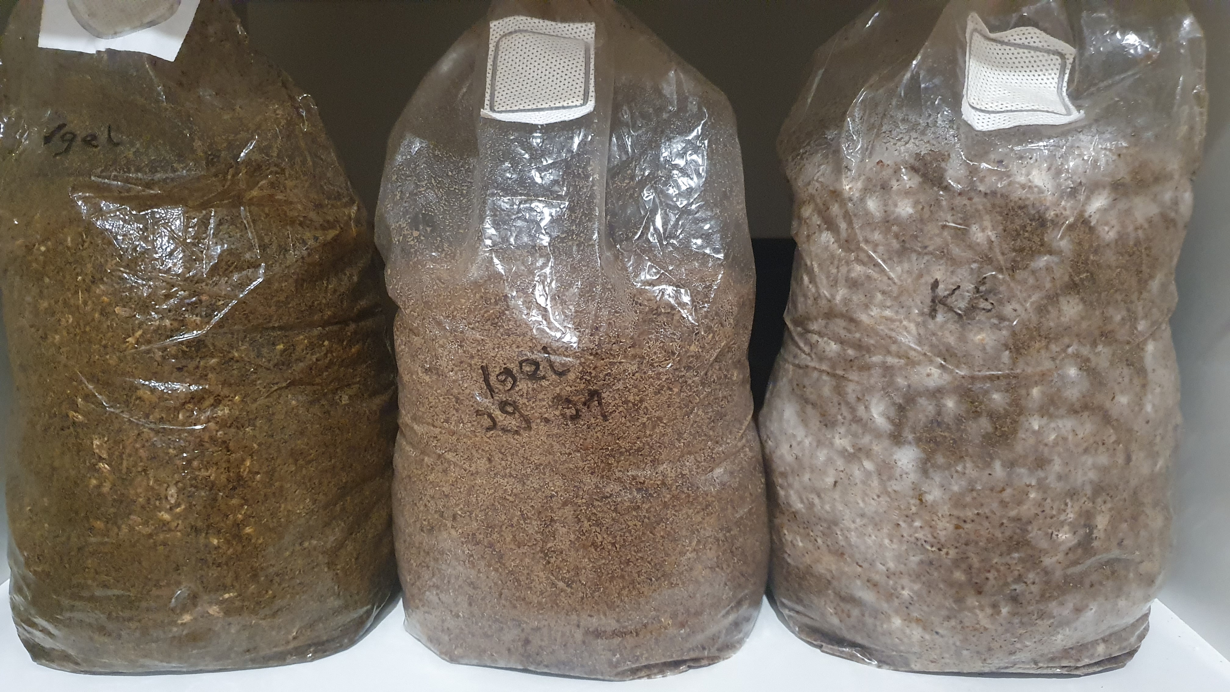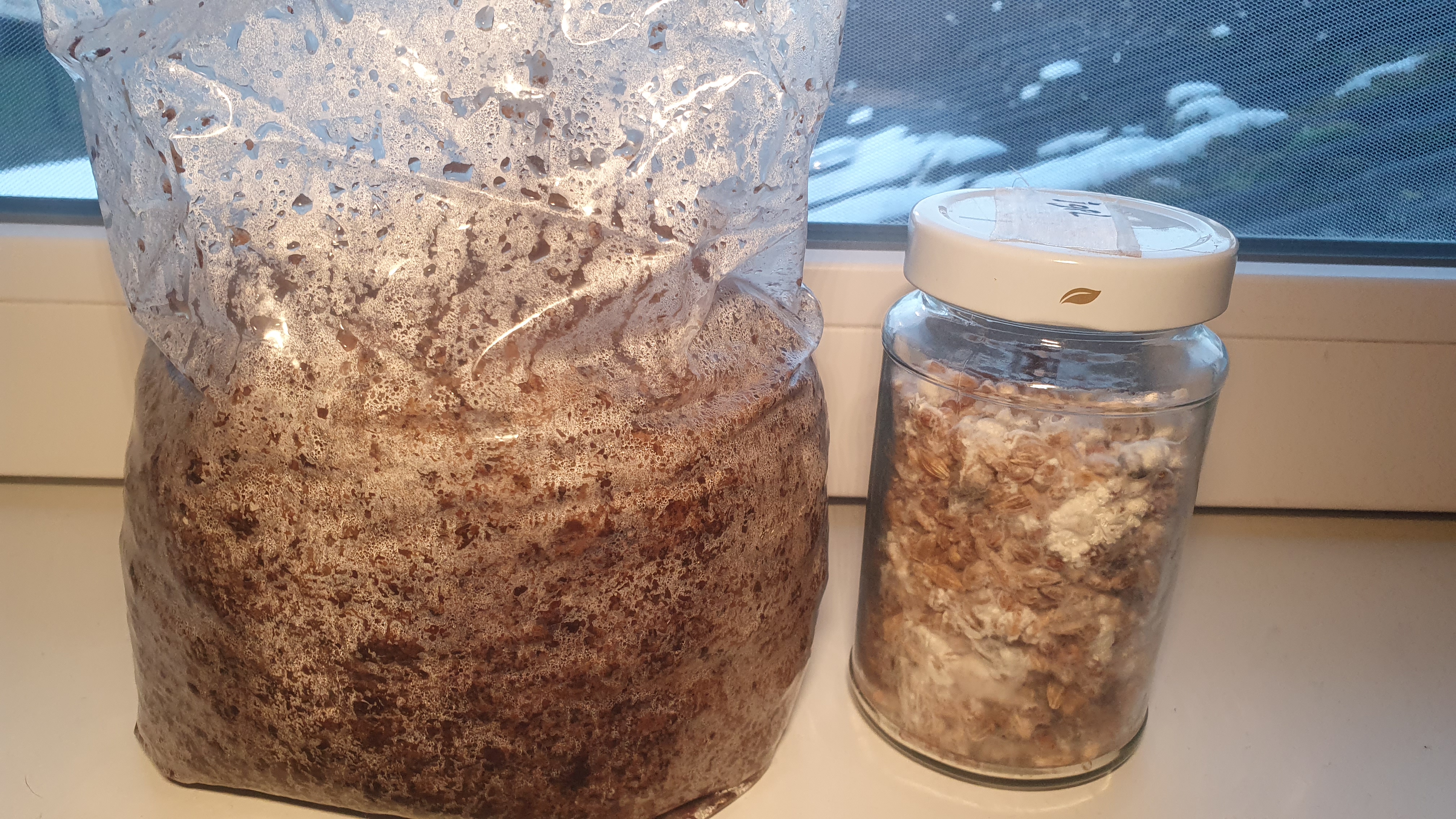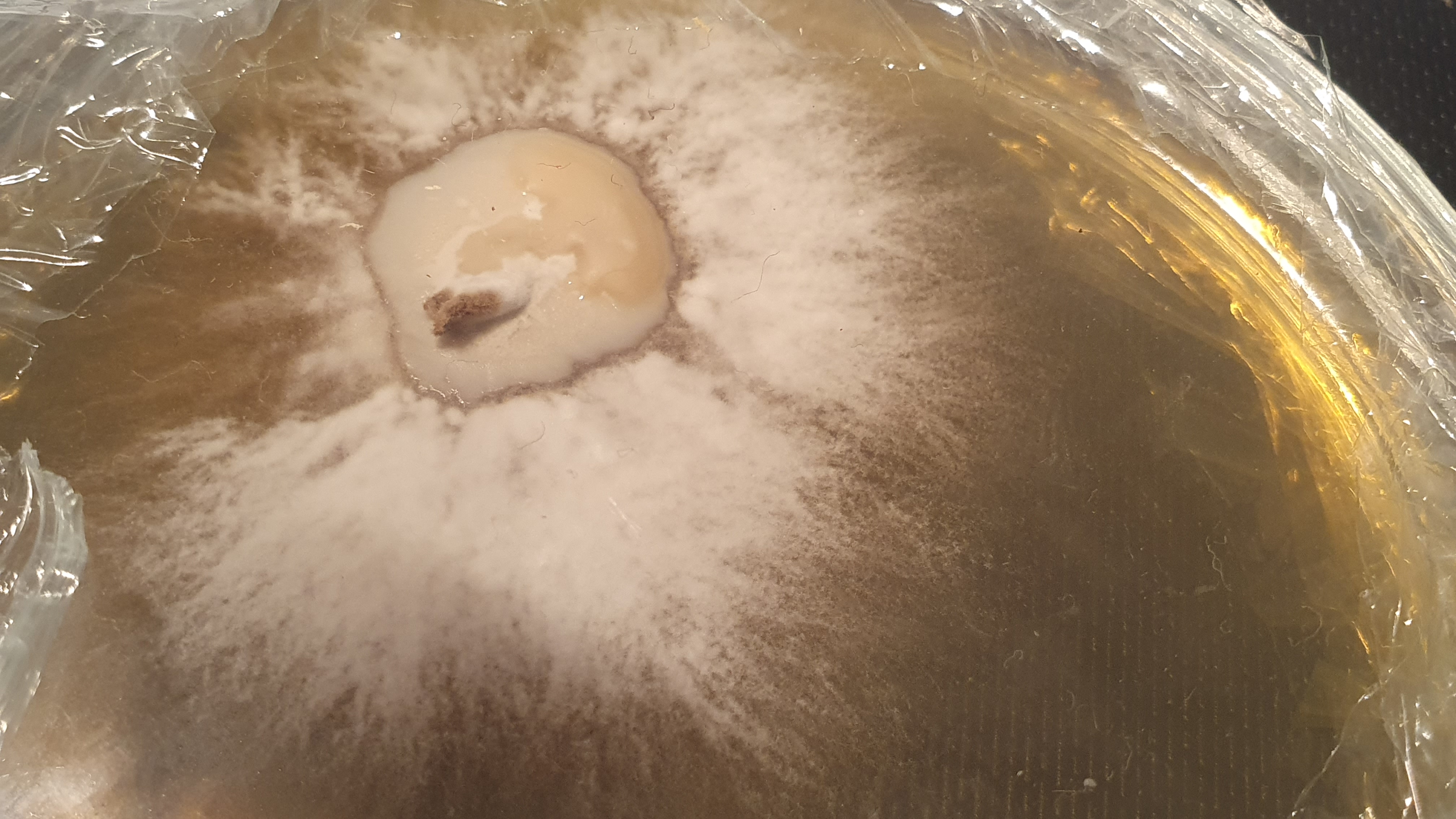 Wie zu erwarten bildete sich um die Pilzstücke nach ein paar Tagen eine Kontie aus, schade drum - dachte ich! Zum Glück nicht entsorgt und mal im Schrank stehen gelassen - siehe da schnell zeigte sich Myzel welches nach ein paar Wochen zu fruchten begann, es wurde überimpft sowie Körnerbrut angesetzt.