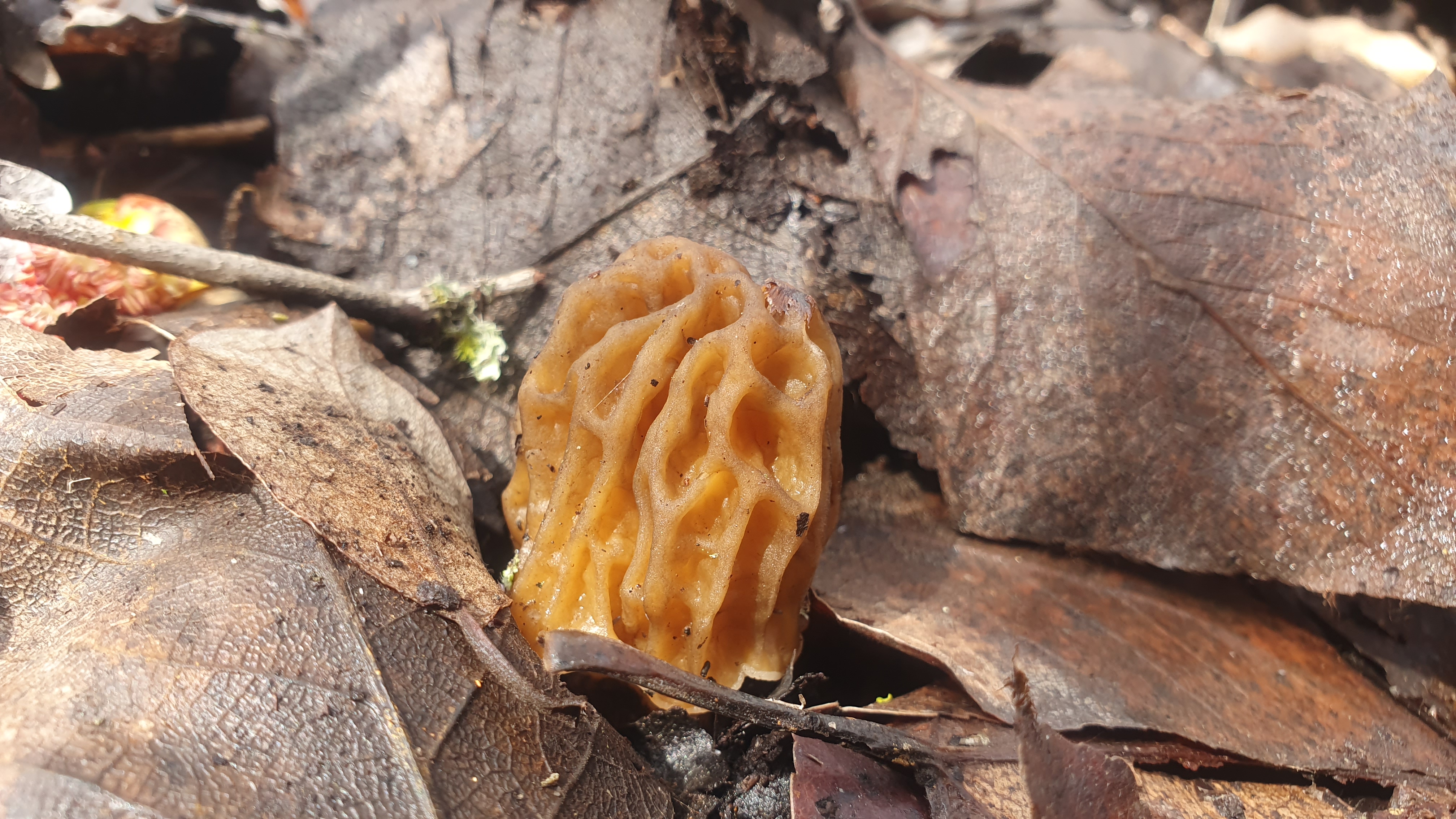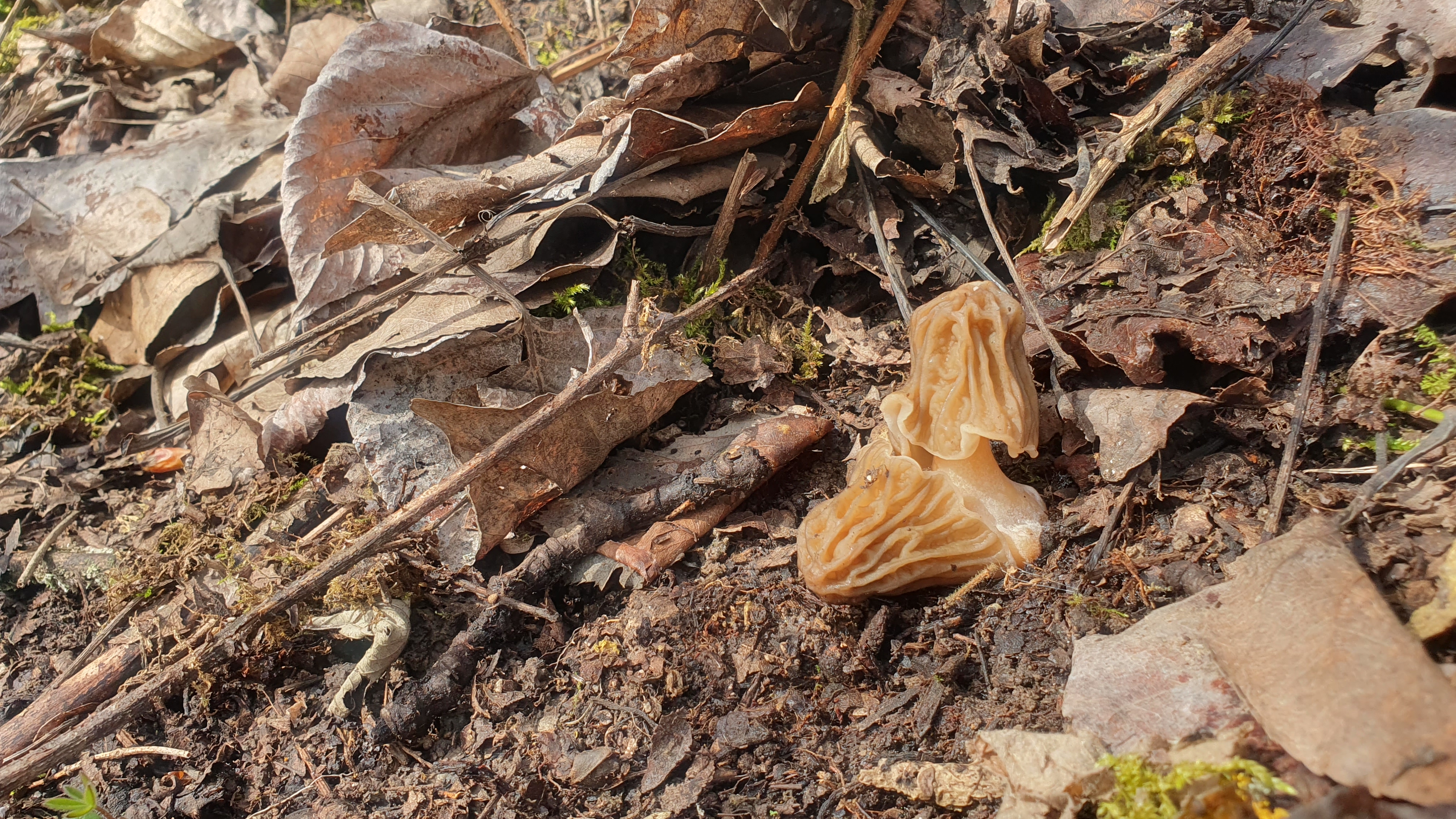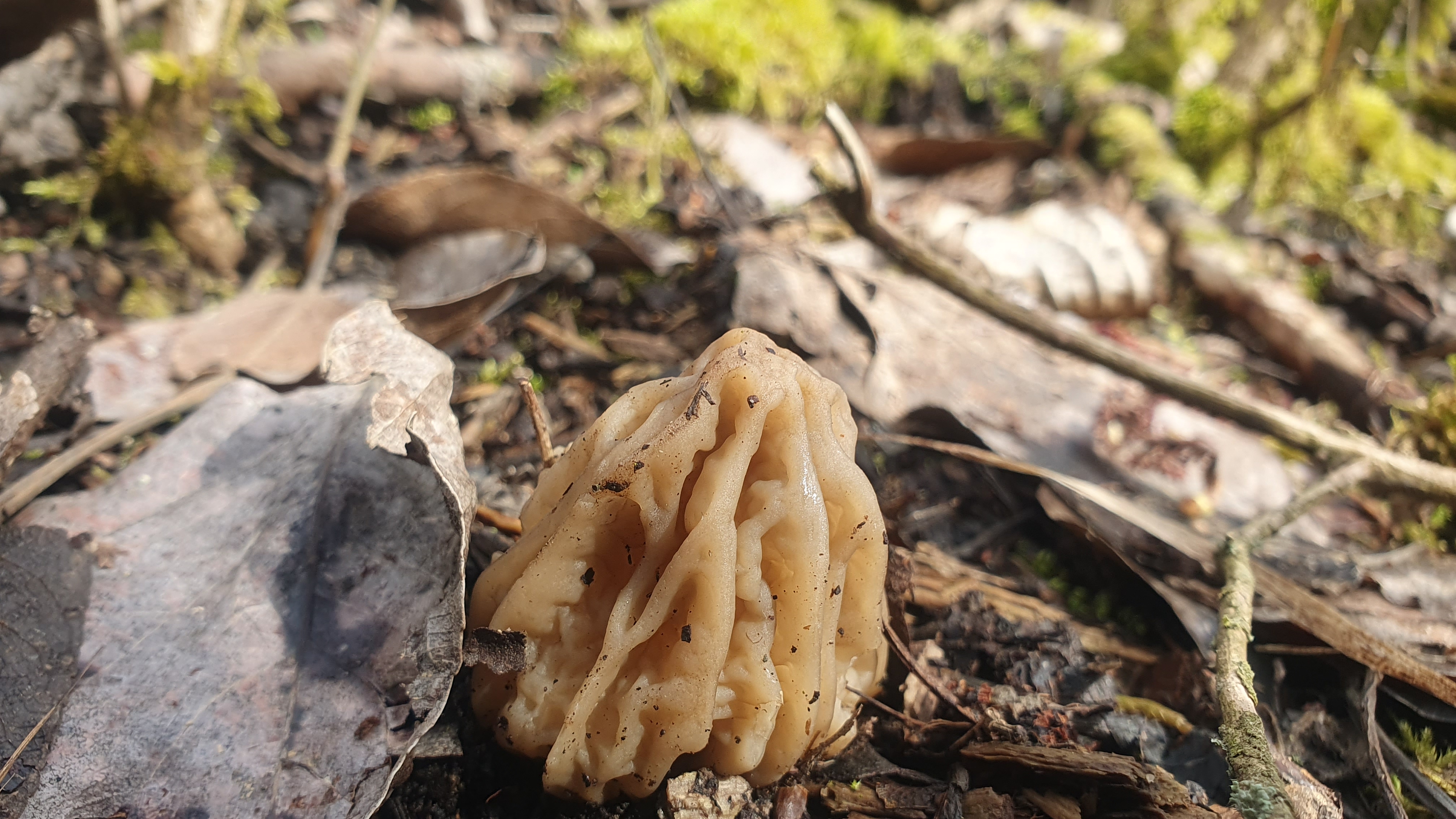 Und das war meine erste Böhmische Verpel, was habe ich mich über diesen Fund gefreut. Dieser Fruchtkörper ist noch recht jung, da sich der cremefarbene Stiel noch nicht gestreckt hat. Auch der hirnartig gewundene Hut ist sehr schön zu erkennen.