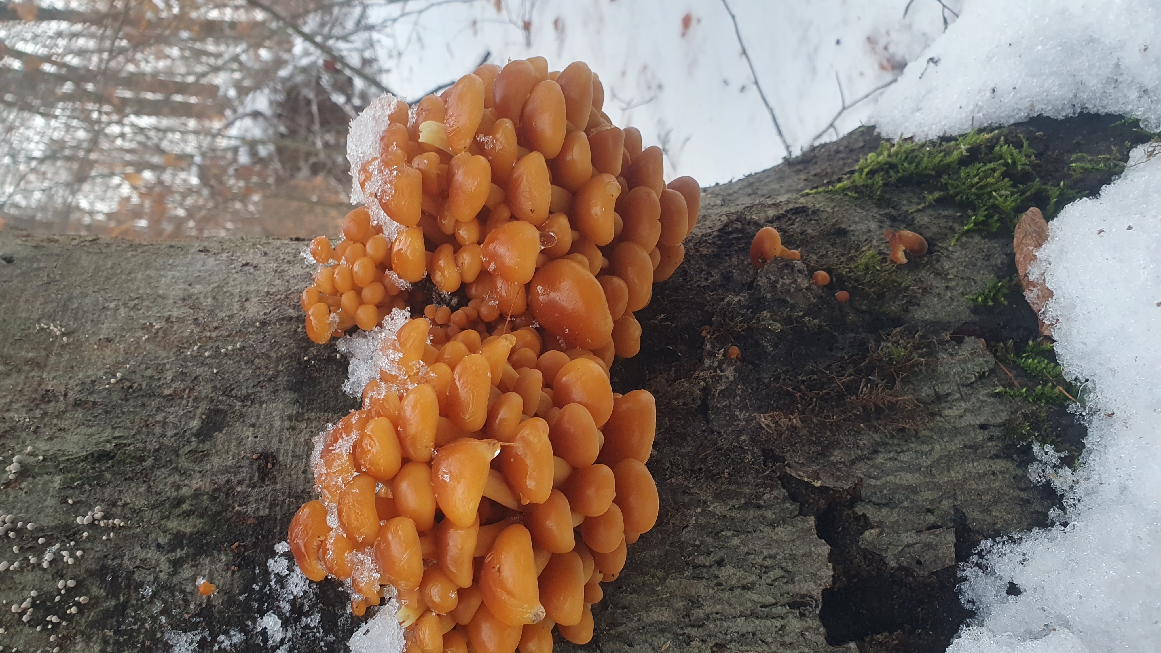 Pünktlich Anfang Dezember kommen die ersten Gemeinen. Samtfußrüblinge (Flammulina velutipes) an meiner Lieblingsstelle, einer abgestorbenen Buche, welche jedes Jahr außergewöhnlich gut Trägt und sehr große Fruchtungen hervorbringt. Jedoch ist der Buchenwälder bzw. unsere Buchenforste keine idealen Standorte für Samtfußrüblinge da es meist zu wenig Titholz gibt und an dem vorhandenen meist andere Arten wie diverse Vertreter der Porlinge, Trameten, Schichtpilze, unsere Austernseitlinge und viele weitere Arten dominieren. Wesentlich erfolgreicher und mehr Stellen auf kleinerem Raum finde ich in Bruchwäldern, Auen, im Parkartigen Gelände (Heckensysteme und ähnliches), hier kann ich ganz vorne mit dabei die Weide nennen aber auch andere Laubgehölze sind gute Fundstellen. Allerdings sollte man den Verwechslungspartner Gifthäubling (Galerina marginata - potenziell tödlich giftig) kennen und sicher bestimmen können, diesen habe ich ein paar Seiten vorher schonmal gepostet.