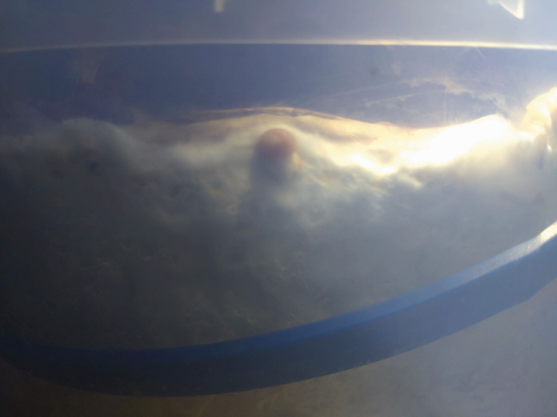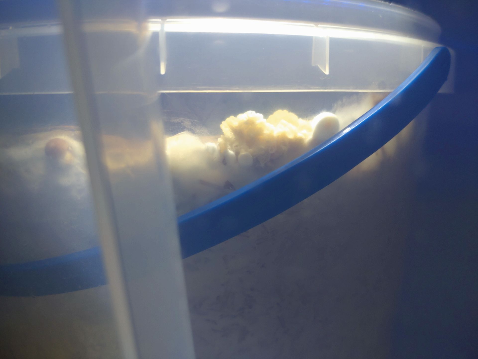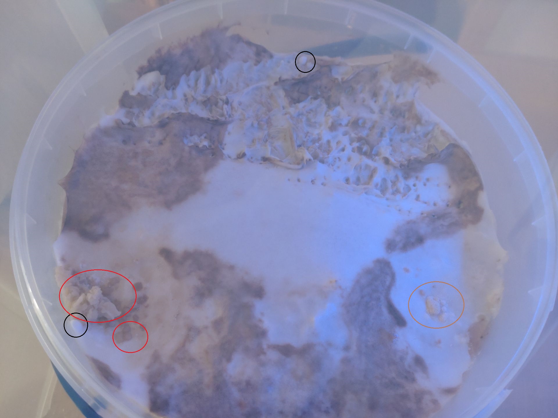 Auffällig ist, dass der Pilz, evtl. bei hoher Feuchte, seltsame Strukturen an der Oberfläche bildet, die aber keine Primordien sind. Die Primordien (schwarze kreise) scheinen leicht zu fluoreszieren, oder sind einfach ein helleres Weiß als der Rest.