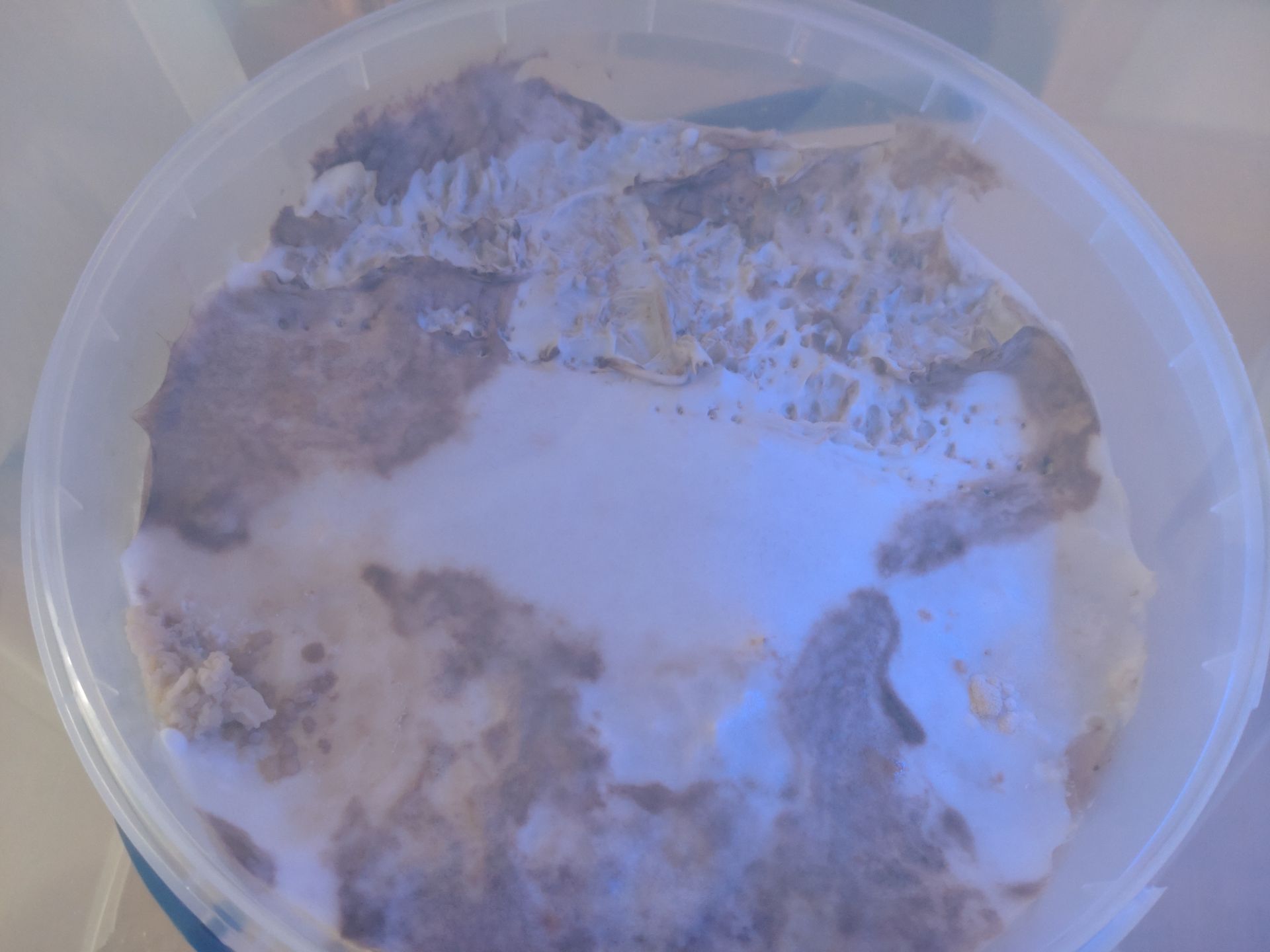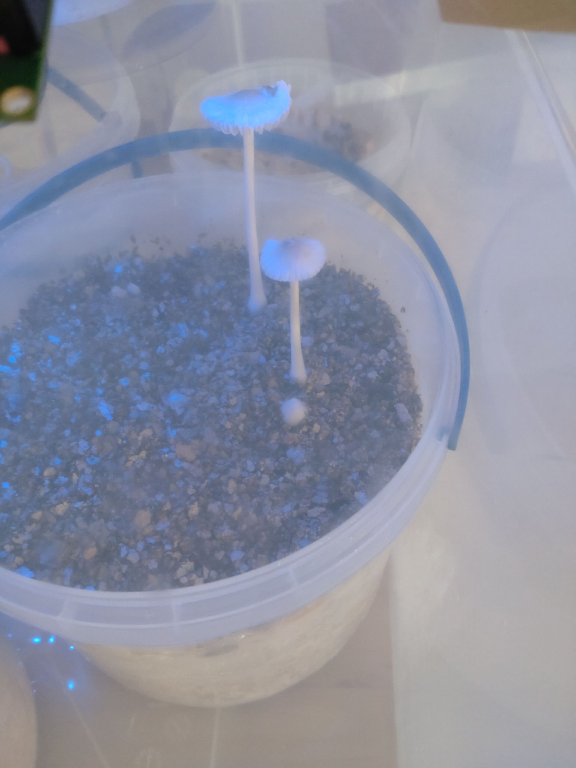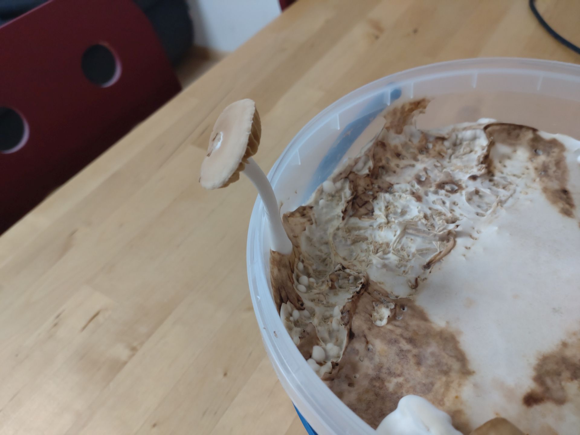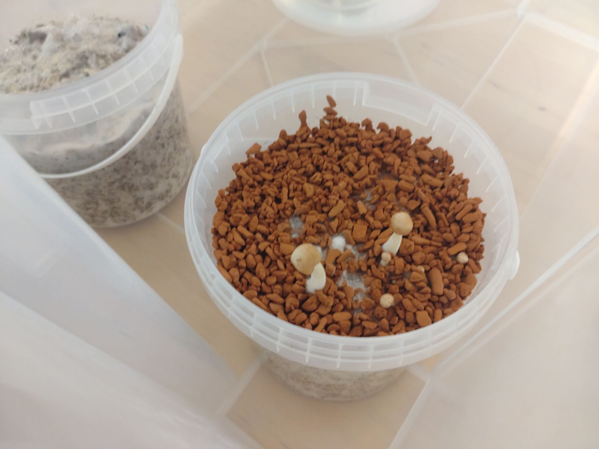 Ich hab das Myzel auf der einen Seite mit einer Gabel zerkratzt und auf der anderen Seite intakt gelassen. Interessanterweise kommen die ersten immer von unterhalb der membranartigen Außenschicht. Deshalb klebt beim einen Pilz auf dem Hut noch ein Myzelfetzen. Später enstanden die Pins dann bei den früheren Ansätzen direkt auf der Außenschicht.