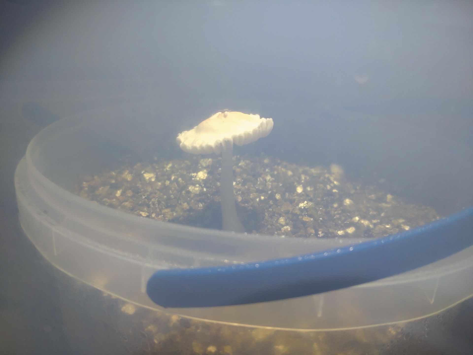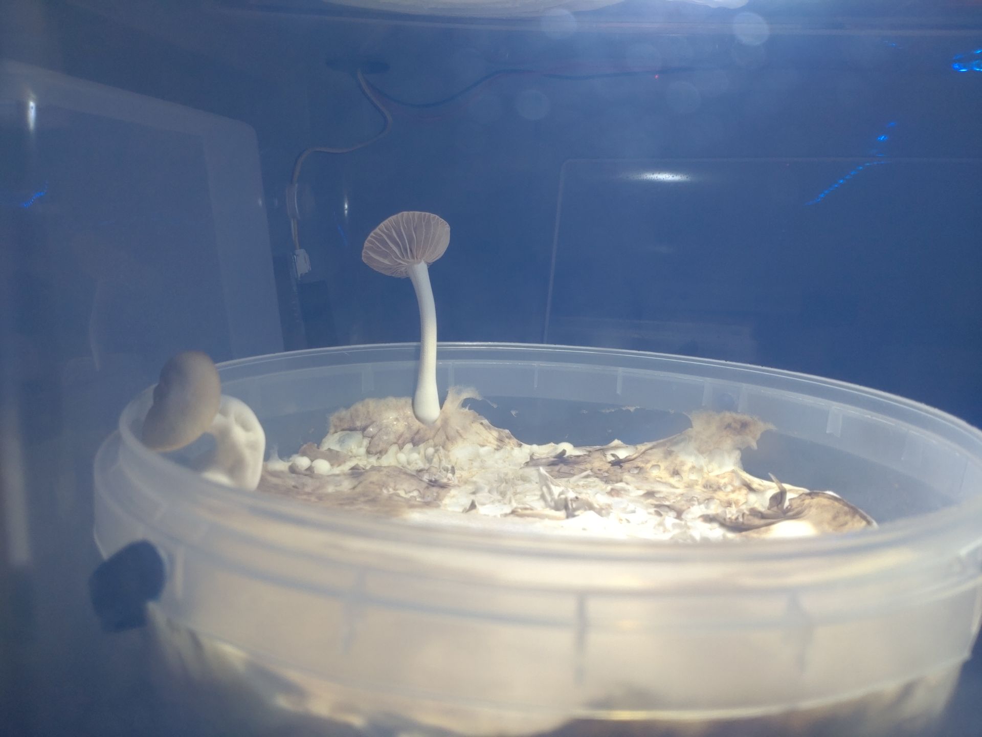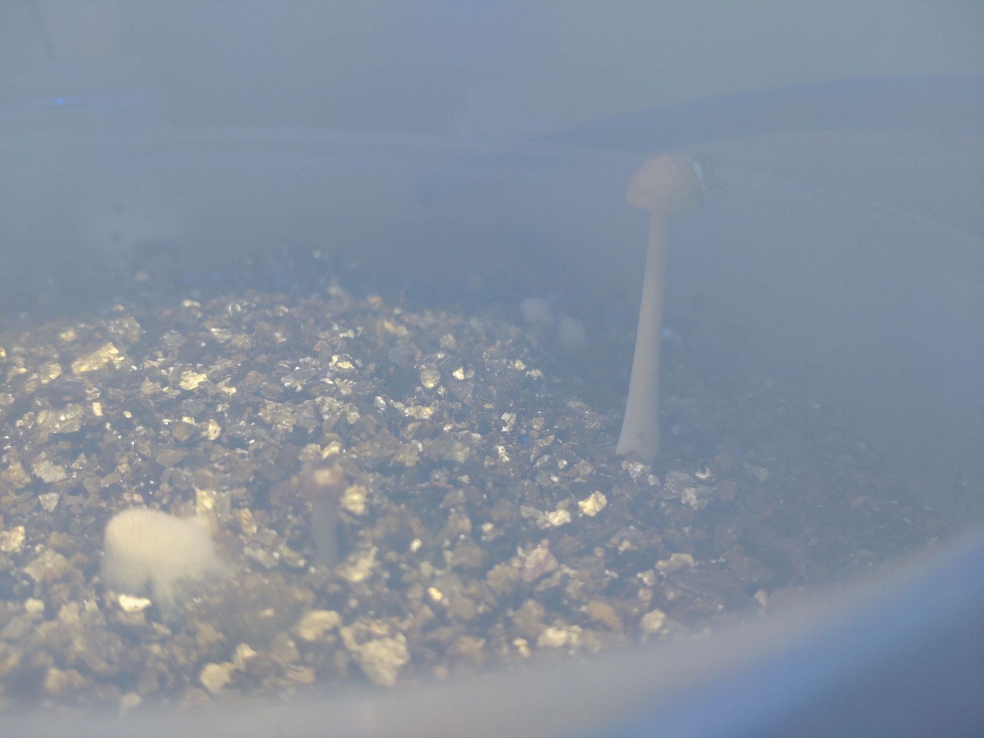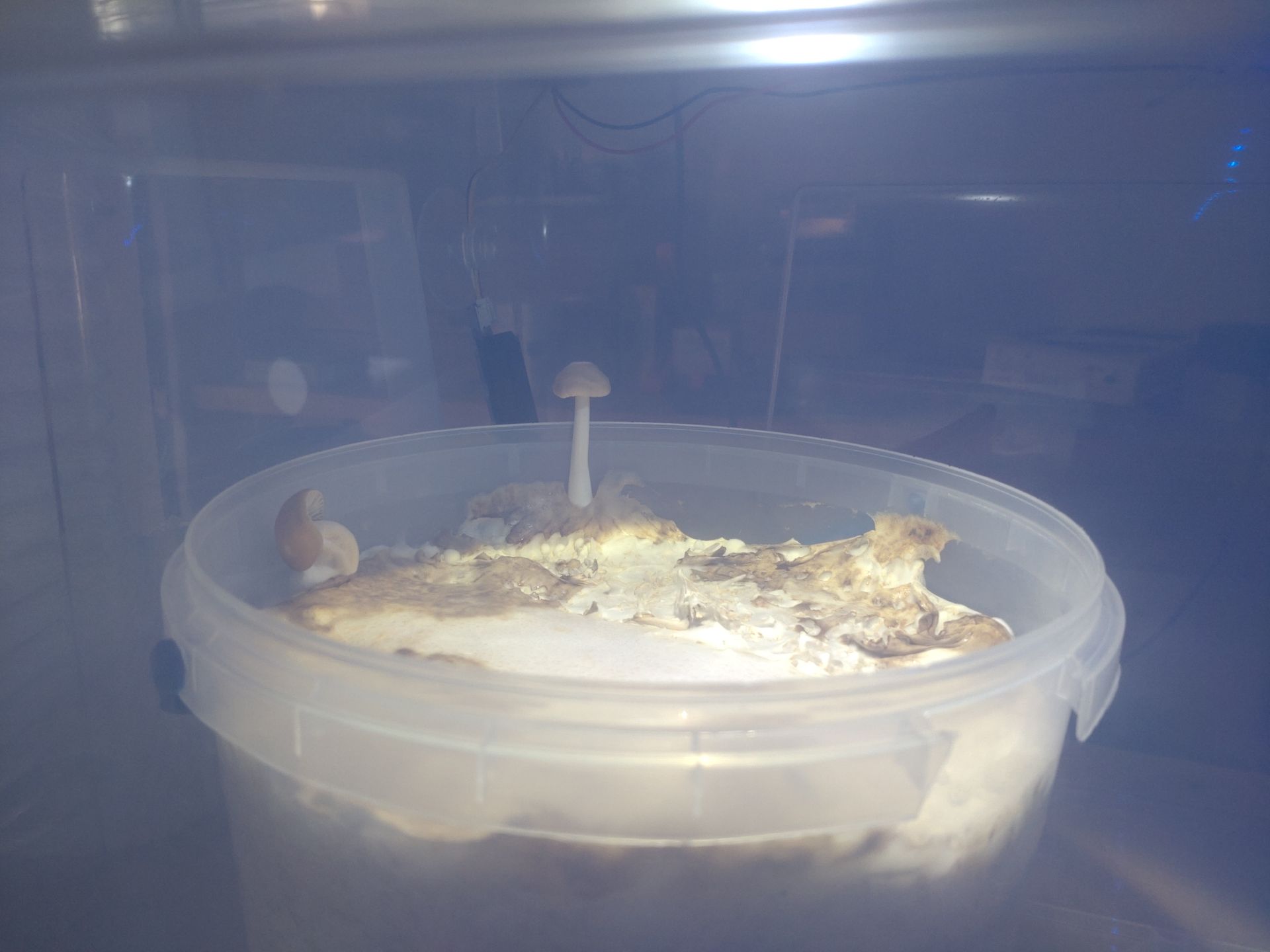 Naja, die alternierende Luftfeuchte soll sowas wie die nächtlichen Taunässe simulieren. Also am Tag antrocknen, in der Nacht nass. Ich vermute dass beides nicht die Ursache für die geringe Fruchtkörperbildung ist, aber ich lasse mich auch gern überaschen.