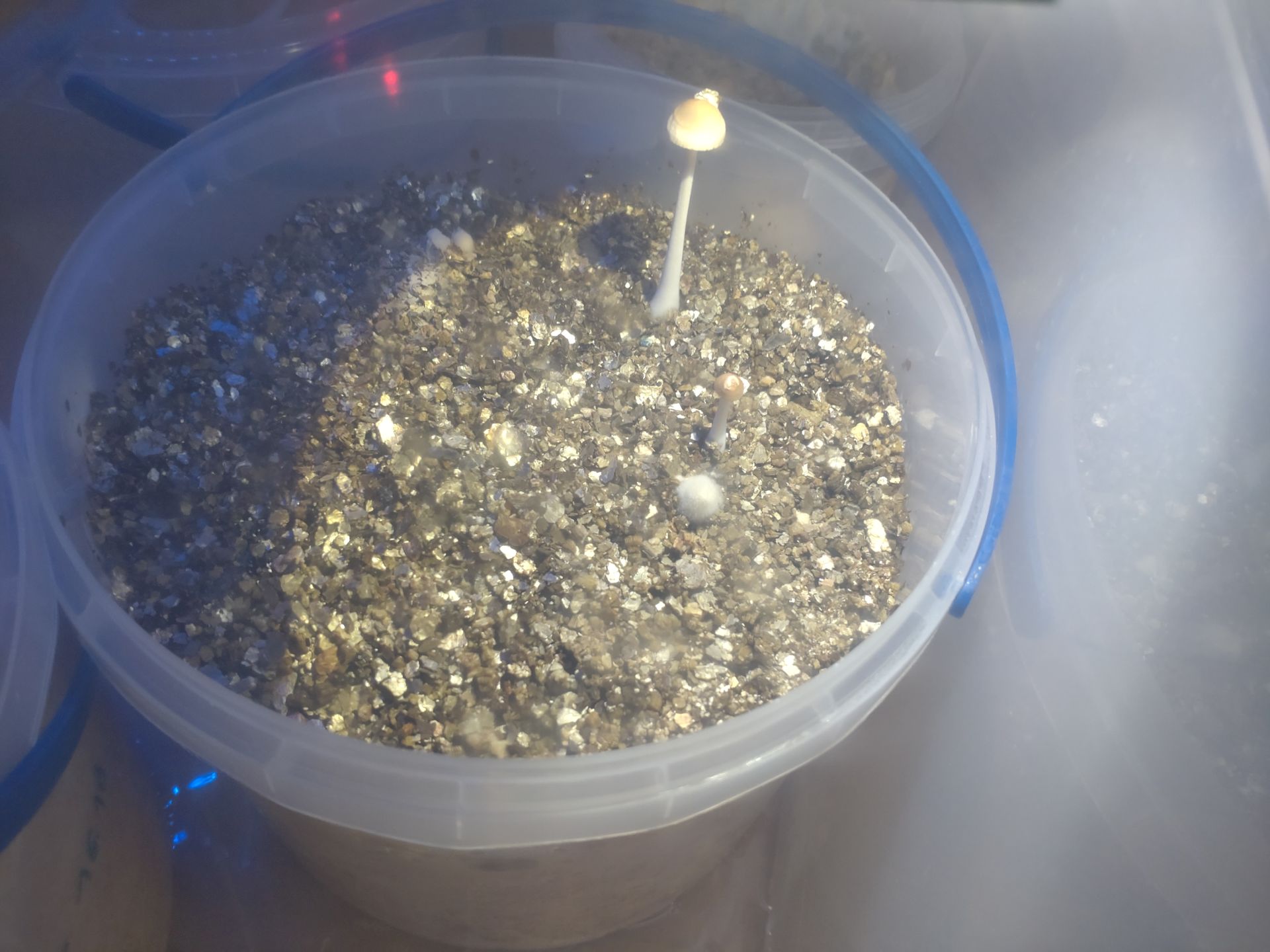 Am Rand... aus Ritzen... nach Verletzungen... das lässt mich denken, dass Primordien eher an frischem Myzel entstehen und dass an der nackten Oberfläche eine fruchtungsunwillige Schutzschicht entsteht. Deswegen die Frage nach der Deckerde. Vermiculit funktioniert bestimmt auch gut.