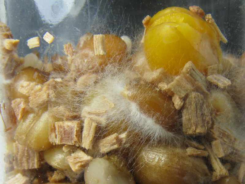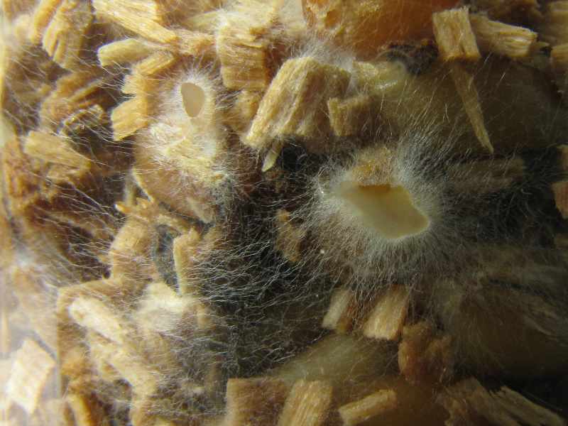 Für kontifrei halte ich die Ansätze nicht. Deswegen werde ich sie lieber nicht schütteln, auch wenn es mir sehr schwerfällt. Andererseits... bei 13 Gläschen mit Sporenmycel könnte ich es vielleicht bei ein paar davon versuchen. Glücklicherweise war mir das Substrat (Weizen, Roggen, Mais und feine Chipsies) beim ersten Sporenversuch etwas zu trocken geraten, so daß sich Bakterien und Hefen kaum ausbreiten können. Dem Mycel scheint es aber sehr zu gefallen. Die relativ trockenen Holzschnipsel werden überraschend gut besiedelt.