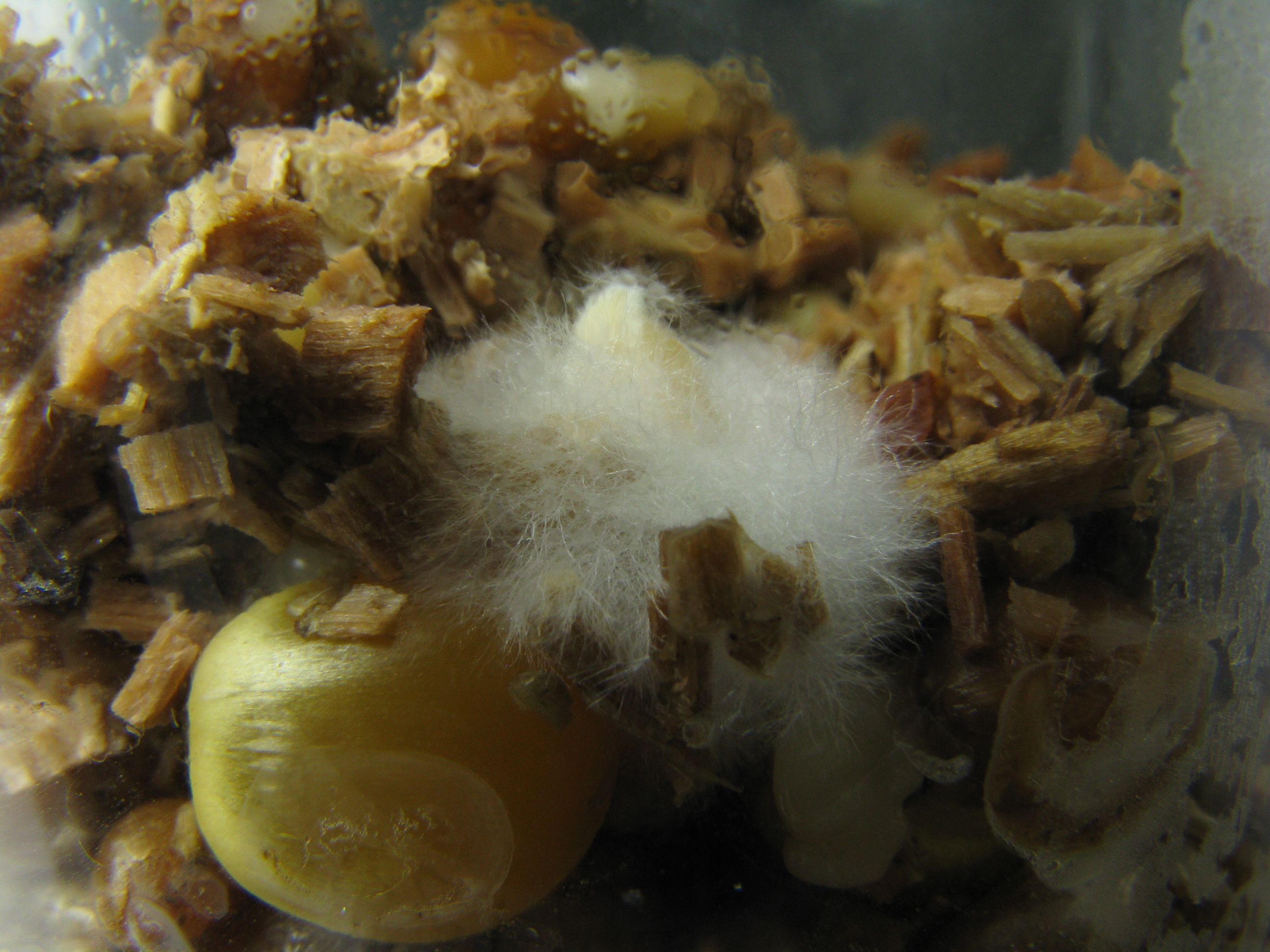 Bin mit der Kamera so nah wie möglich rangegangen, damit man das Mycel einigermaßen erkennen kann. Das gelbe Ding ist ein Maiskorn. Die hellen Punkte sind irgendwelche Krümel von geplatzten Körnern. Der madenförmige Fleck im letzten Bild war mir gar nicht aufgefallen, es ist ein getrockneter Tropfen, der wohl Stärke enthielt.