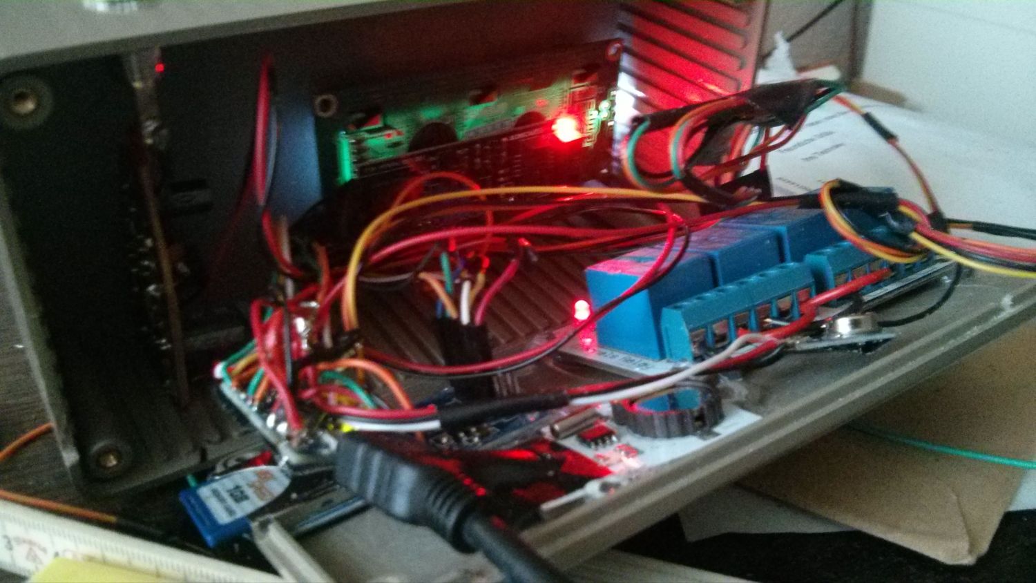 Ich hab das mal provisorisch in ein Karton-"Gehäuse" gesteckt. Das richtige Gehäuse ist aber auch heute gekommen, muss ich nur noch Löcher rein machen.