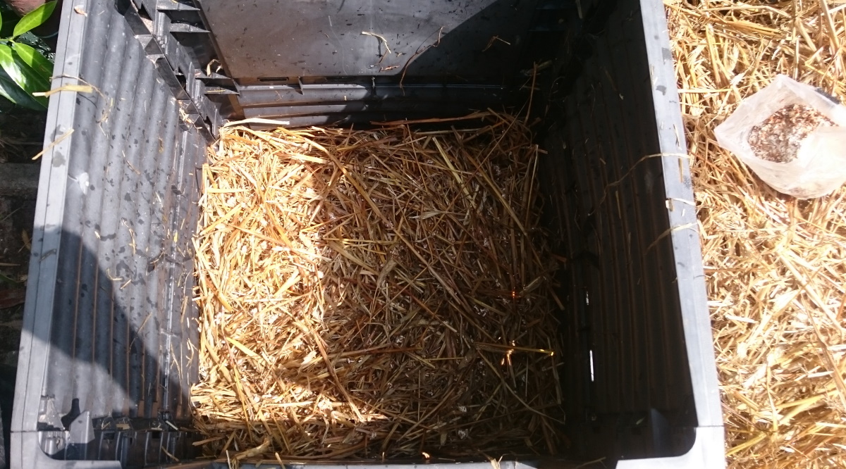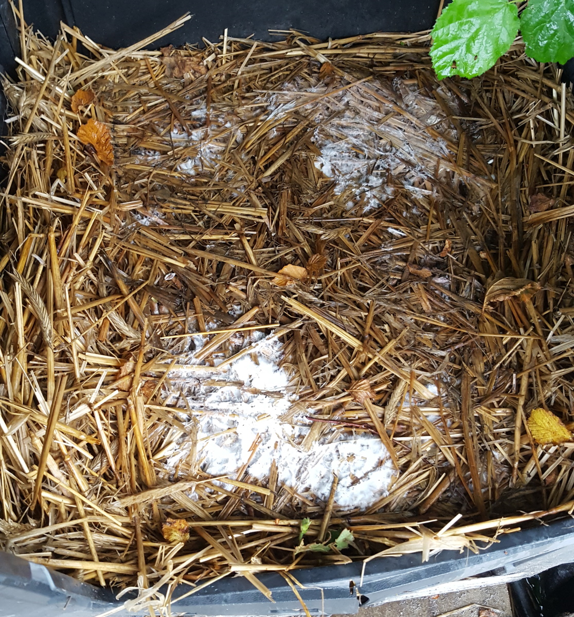Und ein Experiment: Hab heute einen der alten Komposter mit reinem Stroh gefüllt und mit Lungenseitlig beimpft: