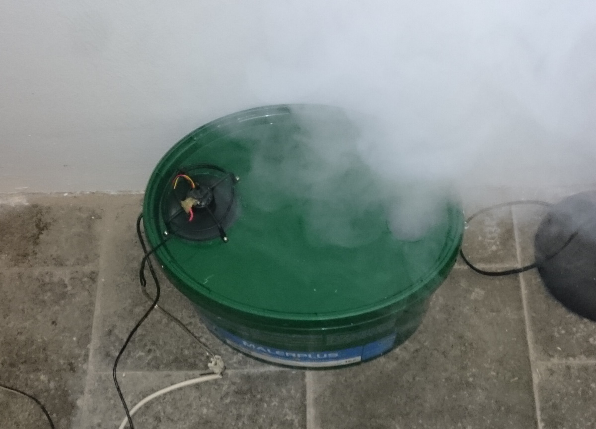 Hab den Vernebler in einen Eimer gepackt, Deckel mit Löchern und Lüfter drauf.