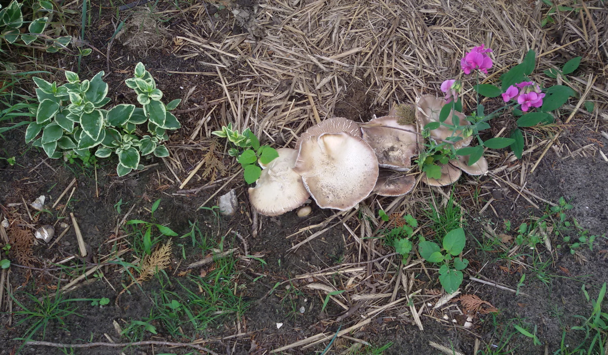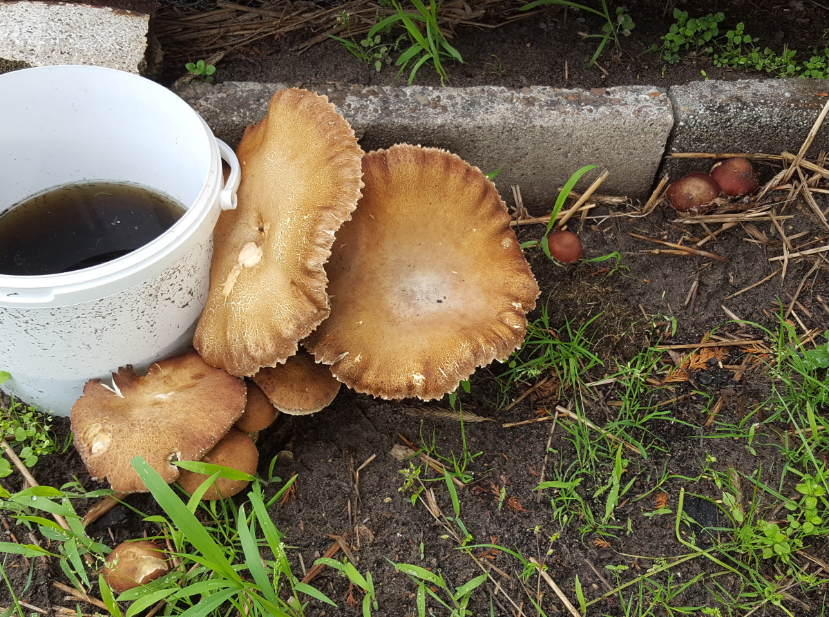 Meine Riesenträuschlinge Outdoor fruchten! Hab vor lauter Freude vergessen, 'n Foto zu machen. Dachte erst, da hätt sich 'n Safranschirmling zwischengemogelt, war aber nur eingerissene Huthaut. Auf den ersten Blick täuschend ähnlich.