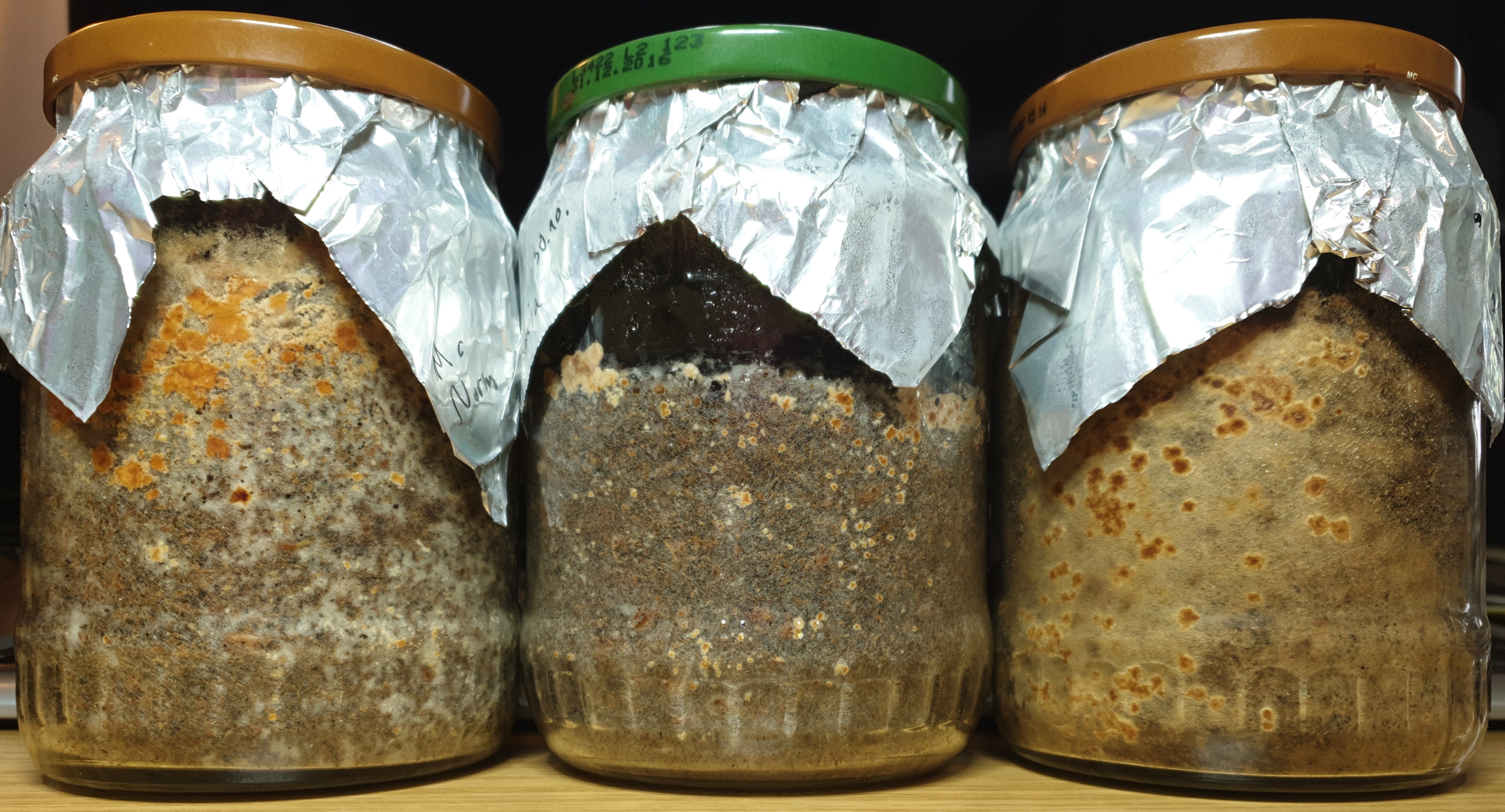 Heute sehen die Petris so aus (Reihenfolge wie oben): Als Brutsubstrat gab's für die Spitzmorcheln ein Gemisch aus Nadelholzpellets, Strohpellets, Getreide und Kaffeesatz, spaßeshalber mit einer dünnen Schicht Pinienride oben drauf. Die Speisemorchel bekam Strohpellets, Laubholzpellets, Getreide, Kaffeesatz und Kalk. Mit den Spitzmorcheln habe ich jeweils drei 720ml-Gurkengläser beimpft, mit der Speisemorchel fünf. Bei letzterer war das Myzel anfangs nicht zu sehen, erst mit einer Lupe und seitlicher Beleuchtung wurde es erkennbar.