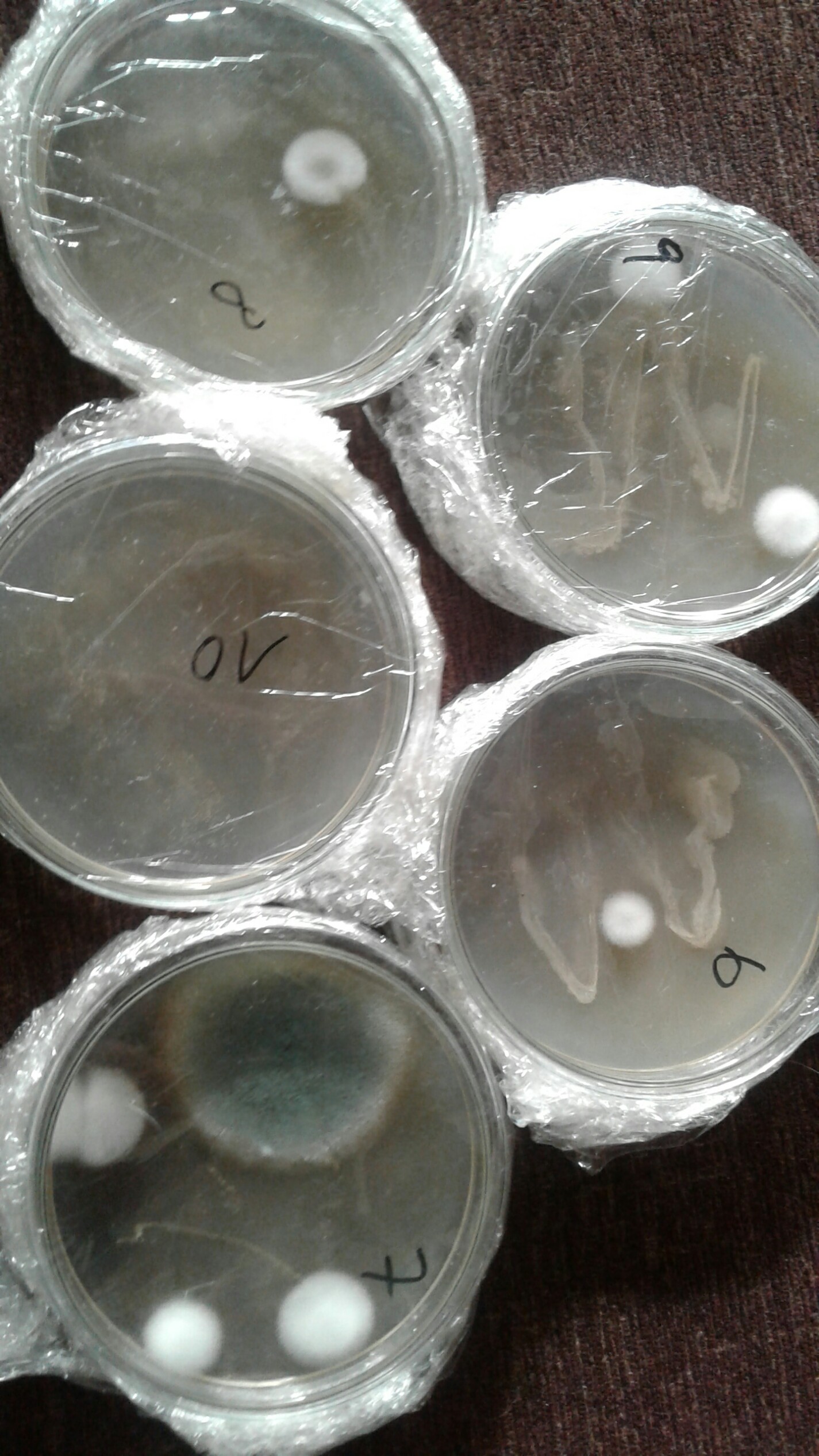 Petri 6 + 2 hatte ich 3 Tage zwischen 28-35 Grad am Kachelofen gelagert. Zweck: schauen ob "der weiße Wuchs" (Kulturpilzmyzel? ) stirbt.... Und. .. schauen ob etwas anderes wächst (einige bakterien- sporen wachsen erst bei höheren Temps)