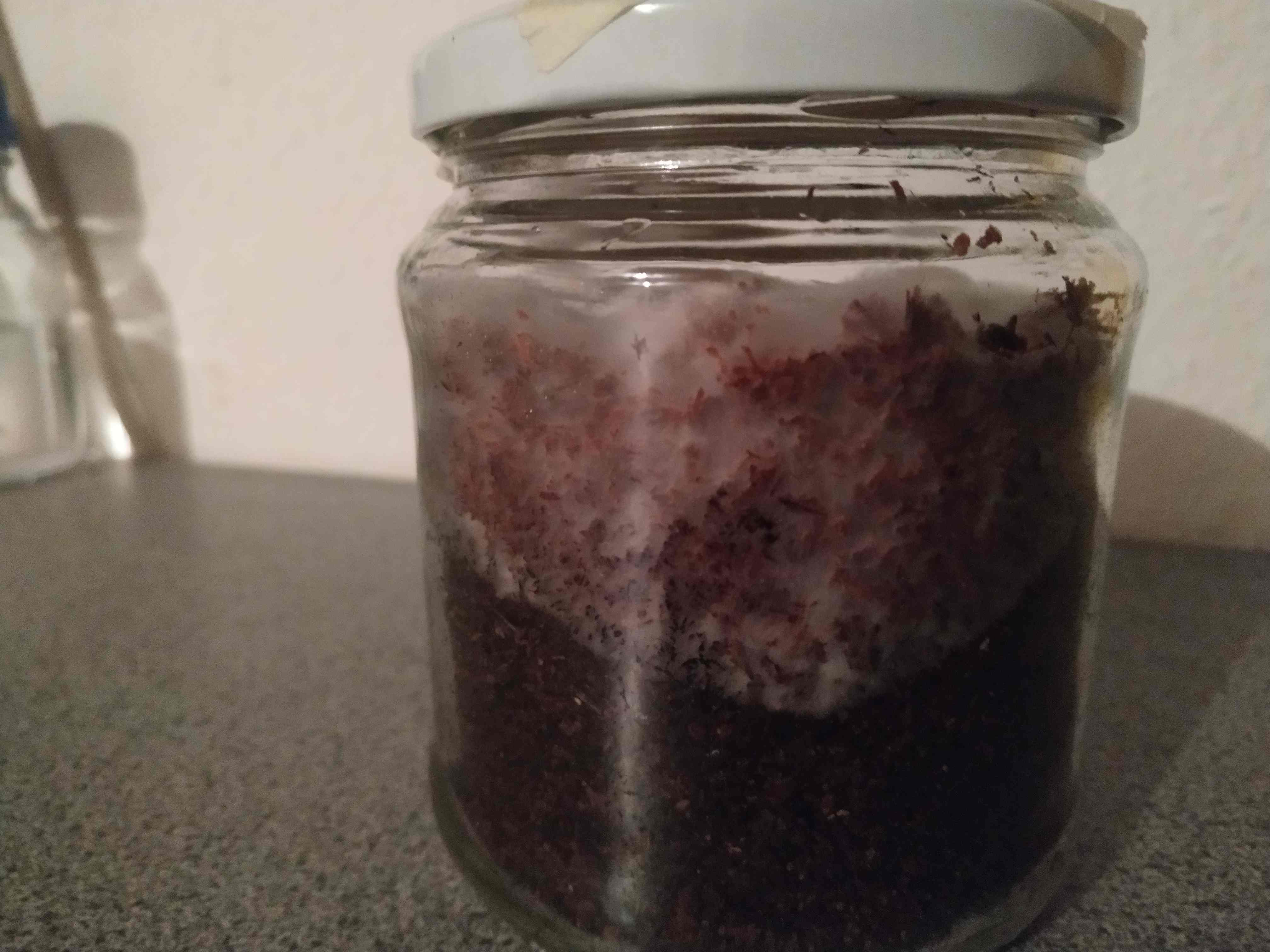 T. nahezu sterile Substrate (Holz) vorfinden fällt es schwer etwas ähnliches für die Sekundärzersetzer anzunehmen. Daher hab ich einfach auch mal ein Stück bewachsenen Agar auf unbehandelten Boden - so wie er von der Wiese kommt - gelegt. Beimpft wurde am 19.11.21. Und jetzt kommt's, der NS scheint sich hier doch tatsächlich behaupten zu können und er beginnt das Substrat zu beiedeln - damit hätte ich nicht gerechnet
